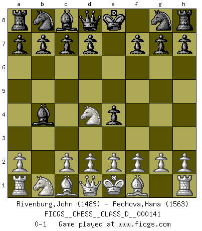 Last move : 0-1 2010 April 7 20:45:54 [Event "FICGS__CHESS__CLASS_D__000141"] [Site "FICGS"] [Date "2010.02.02"] [Round "1"] [White "Rivenburg,John"] [Black "Pechova,Hana"] [Result "0-1"] [WhiteElo "1489"] [BlackElo "1563"] 1.b4 e5 2.Nf3 e4 3.Nd4 Bxb4 0-1 This chess game has been lost on time (started : 2010.02.02 14:33:38) Polish (Sokolsky) opening Player Black won this chess game. Follow this game move after move (download)Human affairs are like a Chess game: only those who do not take it seriously can be called good players. (Hung Tzu Ch'eng) Schach ist die gewalttätigste aller Sportarten. (Garry Kasparov) La vida es como el Ajedrez, con lucha, competición y eventos buenos y malos. (Benjamin Franklin) Donnez-moi un Cavalier en 6e et je gagnerais toutes mes parties. (Steinitz) There are more things in heaven and earth than practically anywhere else. (Unknown)