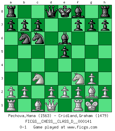 Last move : 0-1 2010 April 4 8:32:46 [Event "FICGS__CHESS__CLASS_D__000141"] [Site "FICGS"] [Date "2010.02.02"] [Round "1"] [White "Pechova,Hana"] [Black "Cridland,Graham"] [Result "0-1"] [WhiteElo "1563"] [BlackElo "1479"] 1.c4 Nf6 2.Nc3 e5 3.Nf3 Nc6 4.g3 d5 5.cxd5 Nxd5 6.Bg2 Be6 7.O-O Nb6 0-1 This chess game has been lost on time (started : 2010.02.02 14:33:38) English Opening Kingside Castling by player White (move 7) Player Black won this chess game. Follow this game move after move (download)The battle for the ultimate truth will never be won. And that's why Chess is so fascinating. (Hans Kmoch) Ich spiele 70 Eröffnungssysteme. (Viktor Kortschnoi) El jugador de combinación piensa hacia adelante; comienza de la posición dada y trabaja las movidas contundentes en su mente. (Emanuel Lasker) Il vaut toujours mieux jouer un plan faux de façon logique que de n'avoir pas de plan du tout. (Victor Kortchnoï) When you stop learning you start dying. (M. Scott Adams)