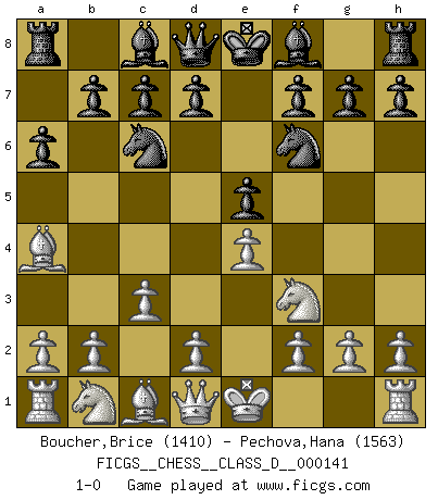 Last move : 1-0 2010 April 15 2:52:51 [Event "FICGS__CHESS__CLASS_D__000141"] [Site "FICGS"] [Date "2010.02.02"] [Round "1"] [White "Boucher,Brice"] [Black "Pechova,Hana"] [Result "1-0"] [WhiteElo "1410"] [BlackElo "1563"] 1.e4 e5 2.Nf3 Nc6 3.Bb5 a6 4.Ba4 Nf6 5.c3 1-0 Ruy Lopez : Morphy defense Player White won this chess game. Follow this game move after move (download)Pawns are born free, yet they are everywhere in chains. (Rick Kennedy) Das typische an einem Großmeister ist, daß er eine gewonnene Position schnell und schmerzlos gewinnt. (Irving Chernev) El Ajedrez era la lengua materna de Capablanca. (Reti) A chaque perte on perd un peu de soi. (Joël Lautier) When you don't know what to do, walk fast and look worried. (Anonymous)