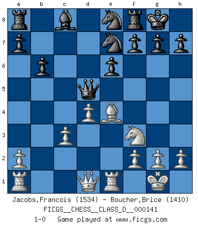 Last move : 1-0 2010 April 13 12:11:16 [Event "FICGS__CHESS__CLASS_D__000141"] [Site "FICGS"] [Date "2010.02.02"] [Round "1"] [White "Jacobs,Francois"] [Black "Boucher,Brice"] [Result "1-0"] [WhiteElo "1534"] [BlackElo "1410"] 1.e4 c5 2.c3 d5 3.exd5 Qxd5 4.d4 cxd4 5.cxd4 e6 6.Nf3 Nf6 7.Nc3 Bb4 8.Bd3 Bxc3+ 9.bxc3 O-O 10.O-O Nc6 11.Re1 b6 12.Bg5 Ne8 13.Be7 Nxe7 14.Be4 1-0 Sicilian : Alapin's variation (2.c3) Kingside Castling by player Black (move 9) Kingside Castling by player White (move 10) Player White won this chess game. Follow this game move after move (download)All I want to do, ever, is just play Chess. (Bobby Fischer) Wenn du auf das Glück wartest, wird das Leben ziemlich langweilig. (Mikhail Nekhemyevich Tal) Para mi, el Ajedrez es la vida y cada partida es como una nueva vida. Todo jugador de Ajedrez suele vivir muchas vidas durante su vida. (Eduard Gufeld) En blitz, le Cavalier l'emporte sur le Fou. (Vlastimil Hort) All the biggest technological inventions created by man - the airplane, the automobile, the computer - says little about his intelligence, but speaks volumes about his laziness. (Mark Kennedy)