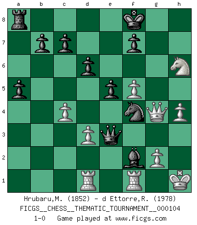 Last move : 1-0 2010 July 12 15:14:13 [Event "FICGS__CHESS__THEMATIC_TOURNAMENT__000104"] [Site "FICGS"] [Date "2010.02.02"] [Round "1"] [White "Hrubaru,Mircea"] [Black "d Ettorre,Rodolfo"] [Result "1-0"] [WhiteElo "1852"] [BlackElo "1978"] 1.e4 e5 2.Nf3 Nc6 3.Bb5 Nf6 4.Qe2 Bc5 5.c3 O-O 6.d3 d6 7.Bg5 h6 8.Bh4 Bd7 9.Nbd2 a6 10.Bxc6 Bxc6 11.Nc4 a5 12.Ne3 Qe7 13.O-O Ba7 14.Rae1 Qe6 15.Nf5 Rfe8 16.Qd1 Nd7 17.Nd2 Nf8 18.Qf3 Ng6 19.Qg4 Qxa2 20.Bf6 Bd7 21.Bxg7 Bxf5 22.exf5 Kxg7 23.c4 Qxb2 24.Ne4 Rg8 25.h4 Kf8 26.Nf6 Qd2 27.Nxg8 Bxf2+ 28.Kh1 Nf4 29.Rd1 Qe3 30.Nxh6 1-0 Ruy Lopez : Berlin defense Kingside Castling by player Black (move 5) Kingside Castling by player White (move 13) Player White won this chess game. Follow this game move after move (download)The essence of Chess is thinking about what Chess is. (David Bronstein) Herr Iljumschinow ist ein etwas merkwürdiger Geschäftsmann: Er arbeitet zusammen mit Leuten wie Muammar al-Gaddafi; früher ist das Saddam Hussein gewesen. (Joel Lautier) Entre mas años cumplo, mas valoro los Peones. (Keres) Roi des jeux et jeu des rois, les échecs portent en eux un sentiment d'infini. Ils donnent à celui qui s'est efforcé d'en approfondir les arcanes l'impression de n'être pas à la mesure de l'homme; en fait, ils constituent un résumé de l'univers, un microcosme, et figurent cette grande échelle qui, dans les plans de la lumière descend jusqu'à la matière, qui des abîmes insondables remonte jusqu'en l'infini de Dieu. (Pyrame) If you are going through hell, keep going. (Winston Churchill)