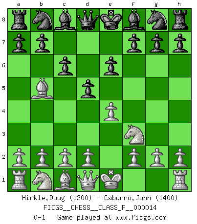Last move : 0-1 2006 November 26 15:36:54 [Event "FICGS__CHESS__CLASS_F__000014"] [Site "FICGS"] [Date "2006.10.17"] [Round "1"] [White "Hinkle,Doug"] [Black "Caburro,John"] [Result "0-1"] [WhiteElo "1200"] [BlackElo "1400"] 1.e4 e6 2.Nf3 d5 3.Bb5+ c6 0-1 This chess game has been lost on time (started : 2006.10.17 9:6:58) French defense Player Black won this chess game. Follow this game move after move (download)I like to say that Bobby Fischer was the greatest player ever. But what made Fischer a genius was his ability to blend an American freshness and pragmatism with Russian ideas about strategy. (Bruce Pandolfini) Gott hat gewollt, dass ich Champion werde. (Surab Azmajparaschvili) No es una movida, aún la mejor movida que tu debas buscar, sino un plan comprensible. (Eugene Znosko-Borovsky) Des idées, des idées, j'en ai cent, j'en ai mille. Des bonnes, des mauvaises, applicables, irréalisables... Il suffit de faire le tri ! (Roos) The meaning of life is that it is to be lived, and it is not to be traded and conceptualized and squeezed into a pattern of systems. (Bruce Lee)
