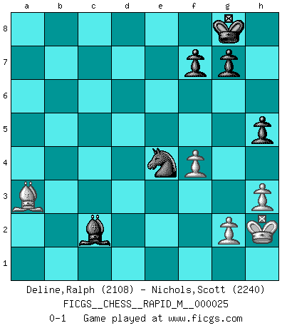 Last move : 0-1 2010 February 16 3:11:27 [Event "FICGS__CHESS__RAPID_M__000025"] [Site "FICGS"] [Date "2010.02.04"] [Round "1"] [White "Deline,Ralph"] [Black "Nichols,Scott"] [Result "0-1"] [WhiteElo "2108"] [BlackElo "2240"] 1.e4 e5 2.Nf3 Nc6 3.Bb5 a6 4.Ba4 Nf6 5.O-O b5 6.Bb3 Bc5 7.a4 Rb8 8.axb5 axb5 9.Nxe5 Nxe5 10.d4 Bxd4 11.Qxd4 d6 12.f4 Nc6 13.Qc3 Ne7 14.Be3 O-O 15.Ba7 Ra8 16.e5 Ne4 17.Qe3 Bb7 18.Nc3 Nxc3 19.Qxc3 Nf5 20.Bf2 Rxa1 21.Rxa1 dxe5 22.Qxe5 Qd7 23.c4 Qd3 24.Bd1 bxc4 25.Qxc7 Nd6 26.Bh4 Qd4+ 27.Bf2 Qxb2 28.Qa5 c3 29.Qa2 Re8 30.h3 h6 31.Kh2 Ra8 32.Qxb2 cxb2 33.Rxa8+ Bxa8 34.Bc2 Be4 35.Bd4 Bxc2 36.Bxb2 h5 37.Ba3 Ne4 0-1 Ruy Lopez : 5.O-O Kingside Castling by player White (move 5) Kingside Castling by player Black (move 14) Player Black won this chess game. Follow this game move after move (download)It's always better to sacrifice your opponent's men. (Savielly Tartakover) Schach ist das schnellste Spiel der Welt, weil man in jeder Sekunde Tausende von Gedanken ordnen muß. (Albert Einstein) Un jugador que trata de regresar una movida en el Ajedrez es un futuro carterista. (Richard Fenton) Des combinaisons [dans le jeu d'échecs] pareilles à des mélodies. Je crois entendre pour ainsi dire la musique des coups... (Vladimir Nabokov) Man with more than one clock never knows what time it is. (Chinese thought)