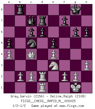 Last move : 1/2-1/2 2010 March 31 6:49:40 [Event "FICGS__CHESS__RAPID_M__000025"] [Site "FICGS"] [Date "2010.02.04"] [Round "1"] [White "Gray,Garvin"] [Black "Deline,Ralph"] [Result "1/2-1/2"] [WhiteElo "2156"] [BlackElo "2108"] 1.e4 c5 2.Nf3 d6 3.d4 cxd4 4.Nxd4 Nf6 5.Nc3 a6 6.Bc4 e6 7.a4 Be7 8.O-O O-O 9.Qe2 Nc6 10.Rd1 Qc7 11.Nxc6 bxc6 12.Bg5 a5 13.h3 h6 14.Bh4 Rd8 15.Bd3 e5 16.Bc4 Nh7 17.Bxe7 Qxe7 18.Rd2 Ng5 19.Qe3 Be6 20.Bxe6 Nxe6 21.Rad1 Qc7 22.Ne2 Rd7 23.Ng3 Rad8 24.Qc3 g6 25.Nf1 Nc5 26.Qc4 Rb8 27.Ne3 1/2-1/2 Sicilian : Najdorf, Lipnitzky attack Kingside Castling by player White (move 8) Kingside Castling by player Black (move 8) This chess game ended in a draw. Follow this game move after move (download)Play the opening like a book, the middle game like a magician, and the endgame like a machine. (Spielmann) Ich hatte Zahnschmerzen im ersten Spiel. In der zweiten Partie tat mir der Kopf weh. In der dritten war es eine Rheuma-Attacke und während der vierten fühlte ich mich nicht gut. Und in der fünften? Nun, man muss doch nicht jedes Spiel gewinnen, oder? (Savielly Grigorievitsch Tartakower) Debes de llevar a tu oponente hacia un profundo y obscuro bosque donde 2+2=5, y el camino que conduce a la salida es suficientemente ancho para solamente uno. (Mikhail Tal) Fischer est le meilleur joueur du monde et Karpov n'est qu'un joueur de bistrot. (Garry Kasparov, agé de 16 ans) In my experience, there's no such thing as luck. (Obi-Wan Kenobi in Star Wars ep.4)