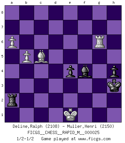Last move : 1/2-1/2 2010 March 17 9:30:17 [Event "FICGS__CHESS__RAPID_M__000025"] [Site "FICGS"] [Date "2010.02.04"] [Round "1"] [White "Deline,Ralph"] [Black "Muller,Henri"] [Result "1/2-1/2"] [WhiteElo "2108"] [BlackElo "2150"] 1.e4 c5 2.c3 d5 3.exd5 Qxd5 4.d4 Nf6 5.Nf3 e6 6.Be3 cxd4 7.cxd4 Nc6 8.Nc3 Qd6 9.a3 Be7 10.Bd3 O-O 11.O-O b6 12.Qe2 Bb7 13.Nb5 Qd7 14.Rfd1 Nd5 15.Ne5 Nxe5 16.dxe5 f5 17.Rac1 a6 18.Nc3 b5 19.Bb1 Rfd8 20.Nxd5 Bxd5 21.g4 g6 22.Ba2 Qb7 23.Rxd5 Rxd5 24.gxf5 gxf5 25.Qf3 Rad8 26.Bxd5 Qxd5 27.Qxd5 Rxd5 28.Rc6 Rxe5 29.Rxa6 Kf7 30.Ra7 Ke8 31.Kf1 Rd5 32.Ke2 e5 33.f3 Rd7 34.Ra8+ Kf7 35.Rh8 Kg6 36.Rb8 Rd5 37.b4 Bd8 38.Bc5 Bg5 39.h4 Rd2+ 40.Ke1 Bf4 41.Rxb5 Kh5 42.Rb7 Kxh4 43.Rg7 Rb2 44.a4 Kh3 45.a5 Ra2 46.Kf1 h5 47.Rg6 h4 48.a6 e4 49.fxe4 fxe4 50.b5 Ra1+ 51.Ke2 Ra2+ 52.Ke1 1/2-1/2 Sicilian : Alapin's variation (2.c3) Kingside Castling by player Black (move 10) Kingside Castling by player White (move 11) 10 pieces endgame at move 49 : White KRBPP , Black KRBPP WHITE : King + 1 Rook 1 Bishop 2 Pawns BLACK : King + 1 Rook 1 Bishop 2 Pawns This chess game ended in a draw. Follow this game move after move (download)Before the endgame, the Gods have placed the middle game. (Siegbert Tarrasch) Ich verstehe mehr vom Schach als irgendein anderer lebender Meister. (José Raúl Capablanca) Una partida de Ajedrez se divide en 3 etapas: la primera cuando piensas que tienes la ventaja, la segunda cuando crees que tienes la ventaja y la tercera... ¡cuando te das cuenta que vas a perder!. (Savielly Tartakower) Les pièces de l'échiquier étaient impitoyables. Elles le retenaient, elles l'absorbaient. Il y avait de l'horreur en cela, mais aussi une harmonie unique. Car, qu'y a-t-il dans le monde, à part les échecs ? (V. Nabokov) I can't decide which is riskier; taking crazy risks, or taking advice on crazy risks from a crazy risk taker. (Gregory House in House M.D.)