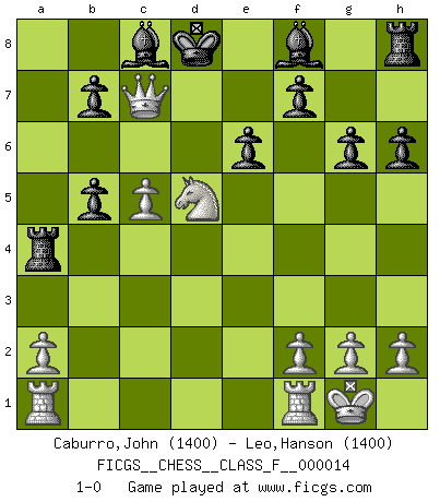 Last move : 1-0 2006 November 7 10:29:34 [Event "FICGS__CHESS__CLASS_F__000014"] [Site "FICGS"] [Date "2006.10.17"] [Round "1"] [White "Caburro,John"] [Black "Leo,Hanson"] [Result "1-0"] [WhiteElo "1400"] [BlackElo "1400"] 1.e4 d5 2.exd5 Qxd5 3.Nf3 h6 4.Nc3 Qd6 5.d4 a6 6.Bd3 Nc6 7.O-O e6 8.Ne4 Qd8 9.c4 Nxd4 10.Nxd4 Qxd4 11.Be3 Qxb2 12.c5 Nf6 13.Bd4 Qxd4 14.Bb5+ axb5 15.Qxd4 Ra4 16.Nxf6+ Ke7 17.Qe5 g6 18.Nd5+ Kd8 19.Qxc7+ 1-0 Scandinavian (centre counter) defense Kingside Castling by player White (move 7) Player White won this chess game. Follow this game move after move (download)In a gambit you give up a Pawn for the sake of getting a lost game. (Samuel Standige Boden) Ich trinke, ich rauche, ich spiele, ich liebe Frauen aber Fernschach ist ein Laster, das ich nicht habe. (Mikhail Nekhemyevich Tal) Coloca el contenido del tablero de Ajedrez en un sombrero, agita las piezas vigorosamente, derrámalas en el tablero desde una altura de medio metro y así obtienes el estilo de Wilhelm Steinitz. (H. E. Bird) D'abord les bases : Jouez et étudiez, puis étudiez et jouez, ensuite jouez et étudiez, puis étudiez et jouez. Deuxièmement : Donnez toujours le meilleur de vous-même ! (Ken Smith) To err is human, to shift the blame on someone else is tactical. (Mladen Jankovic)