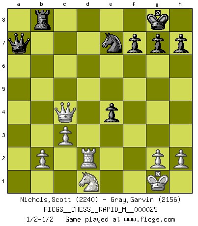 Last move : 1/2-1/2 2010 February 10 13:45:12 [Event "FICGS__CHESS__RAPID_M__000025"] [Site "FICGS"] [Date "2010.02.04"] [Round "1"] [White "Nichols,Scott"] [Black "Gray,Garvin"] [Result "1/2-1/2"] [WhiteElo "2240"] [BlackElo "2156"] 1.e4 c5 2.Nf3 Nc6 3.d4 cxd4 4.Nxd4 Nf6 5.Nc3 e5 6.Ndb5 d6 7.Bg5 a6 8.Na3 b5 9.Nd5 Be7 10.Bxf6 Bxf6 11.c3 O-O 12.Nc2 Bg5 13.a4 bxa4 14.Rxa4 Ne7 15.Bc4 a5 16.O-O Bd7 17.Ra2 Rb8 18.Nde3 Qc7 19.Qd3 Rfd8 20.Rfa1 Bxe3 21.Nxe3 a4 22.Rd1 Bc6 23.Rd2 Qb7 24.Qe2 Bxe4 25.Rxa4 d5 26.Rb4 Qa8 27.Rxb8 Rxb8 28.f3 Bxf3 29.Qxf3 e4 30.Qe2 dxc4 31.Qxc4 Qa1+ 32.Nd1 Qa7+ 1/2-1/2 Sicilian : Pelikan (Lasker/Sveshnikov) variation Kingside Castling by player Black (move 11) Kingside Castling by player White (move 16) This chess game ended in a draw. Follow this game move after move (download)Not only will I predict his triumph over Botvinnik, but I'll go further and say that he'll probably be the greatest Chess player that ever lived. (John Collins) Gott hat gewollt, dass ich Champion werde. (Surab Azmajparaschvili) El Ajedrez era la lengua materna de Capablanca. (Reti) Il s'avisa de me proposer d'apprendre les échecs qu'il jouait un peu... me voilà forcené des échecs. J'achète un échiquier, je m'enferme dans ma chambre, j'y passe des jours et des nuits à vouloir apprendre par cur toutes les parties. (Jean-Jacques Rousseau, Confessions) It's not the size of the dog in the fight, it's the size of the fight in the dog. (Mark Twain)