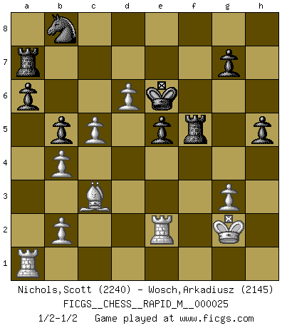 Last move : 1/2-1/2 2010 May 1 23:4:15 [Event "FICGS__CHESS__RAPID_M__000025"] [Site "FICGS"] [Date "2010.02.04"] [Round "1"] [White "Nichols,Scott"] [Black "Wosch,Arkadiusz"] [Result "1/2-1/2"] [WhiteElo "2240"] [BlackElo "2145"] 1.e4 c5 2.Nf3 Nc6 3.d4 cxd4 4.Nxd4 Nf6 5.Nc3 d6 6.Bc4 e6 7.O-O Be7 8.Be3 O-O 9.Bb3 a6 10.f4 Nxd4 11.Bxd4 b5 12.e5 dxe5 13.fxe5 Nd7 14.Ne4 Bb7 15.Nd6 Bxd6 16.exd6 Qg5 17.Qe2 Bd5 18.Rad1 Bxb3 19.axb3 e5 20.Bf2 f5 21.c4 f4 22.Qf3 Qf5 23.Qd5+ Qf7 24.c5 Qxd5 25.Rxd5 Rac8 26.b4 Kf7 27.Ra1 Ke6 28.Rd3 Rc6 29.Rh3 h6 30.Be1 Rf5 31.Rha3 Nb8 32.Bc3 Rc8 33.Rd1 Rd8 34.g3 fxg3 35.hxg3 Rdf8 36.Rd2 R8f7 37.Kg2 h5 38.Ra1 Ra7 39.Re2 1/2-1/2 Sicilian defense Kingside Castling by player White (move 7) Kingside Castling by player Black (move 8) This chess game ended in a draw. Follow this game move after move (download)Capture of the adverse King is the ultimate but not the first object of the game. (William Steinitz) Jede Eröffnung ist gut genug um gespielt zu werden, wenn nur ihr Ruf schlecht genug ist. (Savielly Grigorievitsch Tartakower) Hay dos clases de hombres: aquellos que se conforman en dejarse llevar por las circunstancias y que juegan barajas y aquellos decididos a controlar las circunstancias y que juegan al Ajedrez. (Mortimer Collins) Un journaliste : 'Vous préférez avoir une dame de plus sur l'échiquier ou au lit ?' Boris Spassky : 'Ca dépend de la position.' Panic is a sudden desertion of us, an a going over to the enemy of our imagination. (Christian Nevell Bovee)