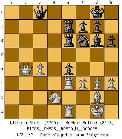 Last move : 1/2-1/2 2010 March 4 22:7:5 [Event "FICGS__CHESS__RAPID_M__000025"] [Site "FICGS"] [Date "2010.02.04"] [Round "1"] [White "Nichols,Scott"] [Black "Markus,Roland"] [Result "1/2-1/2"] [WhiteElo "2240"] [BlackElo "2118"] 1.e4 c6 2.d4 d5 3.Nc3 dxe4 4.Nxe4 Bf5 5.Nc5 e5 6.Nxb7 Qb6 7.Nc5 Bxc5 8.dxc5 Qxc5 9.c3 Nf6 10.Be3 Qe7 11.Bc4 Nbd7 12.Nf3 O-O 13.O-O Nb6 14.Bxb6 axb6 15.Re1 Rfd8 16.Qc1 Be4 17.Qg5 Re8 18.Qg3 h6 19.Bb3 b5 20.h3 Qc7 21.a3 Rab8 22.Rac1 Re7 23.Nd2 Bh7 24.c4 b4 25.axb4 Rxb4 26.Qc3 c5 27.Re3 Qb8 28.Ra1 Bg6 29.Ba4 Nh5 30.g3 Nf6 31.Bc6 Kh7 32.b3 Rb6 33.Bg2 e4 34.Rae1 Rbe6 35.Qa5 Qc8 36.b4 cxb4 37.Qxb4 Kg8 38.f3 1/2-1/2 Caro-Kann : Classical variation Kingside Castling by player Black (move 12) Kingside Castling by player White (move 13) This chess game ended in a draw. Follow this game move after move (download)If cunning alone were needed to excel, women would be the best Chess players. (Albin) Es gibt nur zwei wahre Schachgenies - das andere war Wilhelm Steinitz, der Weltmeister von 1872 bis 1894. (Robert James Fischer) El Ajedrez es el gimnasio de la mente. (Blaise Pascal) La vie et les Echecs sont tous les deux une lutte constante. (Lasker) To send light into the darkness of men's hearts - such is the duty of the artist. (Schumann)