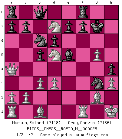 Last move : 1/2-1/2 2010 April 9 6:18:10 [Event "FICGS__CHESS__RAPID_M__000025"] [Site "FICGS"] [Date "2010.02.04"] [Round "1"] [White "Markus,Roland"] [Black "Gray,Garvin"] [Result "1/2-1/2"] [WhiteElo "2118"] [BlackElo "2156"] 1.e4 c5 2.Ne2 Nf6 3.Nbc3 d6 4.g3 Nc6 5.Bg2 g6 6.d3 Bg7 7.O-O O-O 8.h3 Bd7 9.f4 Qc8 10.g4 h5 11.g5 Ne8 12.f5 gxf5 13.Nf4 fxe4 14.Nxe4 Bd4+ 15.Nf2 h4 16.c3 Be5 17.Nd5 Ng7 18.Qa4 Nf5 19.Ng4 Kg7 20.Ngf6 Ng3 21.Nxd7 Ne2+ 22.Kh1 Ng3+ 1/2-1/2 Sicilian : Keres variation (2.Ne2) Kingside Castling by player White (move 7) Kingside Castling by player Black (move 7) This chess game ended in a draw. Follow this game move after move (download)Chess is life. (Bobby Fischer) Die Arbeit ist etwas Unnatürliches. Die Faulheit allein ist göttlich. (Anatole France) No hay precio que no valga la pena por la cabellera del Rey enemigo. (Koblentz) Botvinnik disait en comparant les échecs à la musique: Il existe une science dont le but est l'étude de l'acoustique et des sons. Mais il y a aussi un art qui se sert de l'océan des sons : c'est la musique. De toute évidence, il en est de même pour la pensée. La logique est l'étude des lois de la réflexion et les échecs reflètent, en tant qu'art, le côté logique de la réflexion, sous la forme d'images artistiques... Extrait de Fischer - Spassky, Reykjavik 1972 par Alexander & F. Wyndham (Ed. Solar), p 37. Programmer - an organism that turns coffee into software. (Anonymous)