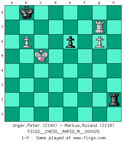 Last move : 1-0 2010 June 4 9:6:13 [Event "FICGS__CHESS__RAPID_M__000025"] [Site "FICGS"] [Date "2010.02.04"] [Round "1"] [White "Unger,Peter"] [Black "Markus,Roland"] [Result "1-0"] [WhiteElo "2140"] [BlackElo "2118"] 1.d4 Nf6 2.Nf3 d5 3.c4 e6 4.Nc3 c6 5.Bg5 Be7 6.e3 O-O 7.Bd3 h6 8.Bh4 dxc4 9.Bxc4 Nbd7 10.Rc1 b5 11.Bd3 Bb7 12.O-O b4 13.Bxf6 Nxf6 14.Ne4 Nd7 15.Qa4 a5 16.Rfd1 Qc7 17.Ned2 Rfd8 18.Qc2 Rac8 19.Bh7+ Kh8 20.Be4 Bd6 21.Qc4 a4 22.Qe2 Nf6 23.Bc2 Ra8 24.Ne4 b3 25.axb3 axb3 26.Bd3 Nxe4 27.Bxe4 Ra2 28.h3 Rda8 29.Bb1 Ba6 30.Bd3 Qb6 31.Bxa6 R8xa6 32.Rb1 Kg8 33.Rdc1 c5 34.dxc5 Bxc5 35.Ne5 Ra7 36.Qd3 Qd6 37.Qc3 Bb4 38.Qxb3 Qxe5 39.Qxb4 R7a5 40.Qb7 Ra7 41.Rc8+ Kh7 42.Qb3 g6 43.f4 Qg7 44.Rc5 g5 45.Qd3+ Qg6 46.f5 exf5 47.Rxf5 Kg8 48.Rbf1 Ra1 49.Qd8+ Kh7 50.Qd5 Rxf1+ 51.Rxf1 Qe6 52.Qxe6 fxe6 53.Rb1 Ra5 54.b4 Rb5 55.Kf2 Kg6 56.Ke2 Kf7 57.Kd3 Ke7 58.e4 Kd6 59.Kc4 Re5 60.Kd4 Rb5 61.g4 Kd7 62.Rd1 Kc7 63.Rc1+ Kb7 64.Rc3 Kb6 65.Rc8 Kb7 66.Rh8 Kc7 67.Rxh6 Kd6 68.Kc3 Re5 69.Rh5 Rxe4 70.b5 Re5 71.Kb4 Rd5 72.Rh8 Kc7 73.Ka5 Rd3 74.b6+ Kc6 75.Rc8+ Kb7 76.Rc7+ Kb8 77.Rc5 Kb7 78.Rxg5 Ra3+ 79.Kb5 Rb3+ 80.Kc5 Rxh3 81.Rg7+ Kb8 82.g5 Rh2 83.g6 1-0 Queen's pawn game Kingside Castling by player Black (move 6) Kingside Castling by player White (move 12) 10 pieces endgame at move 67 : White KRPPPP , Black KRPP WHITE : King + 1 Rook 4 Pawns BLACK : King + 1 Rook 2 Pawns 9 pieces endgame at move 69 : White KRPPP , Black KRPP WHITE : King + 1 Rook 3 Pawns BLACK : King + 1 Rook 2 Pawns 8 pieces endgame at move 78 : White KRPPP , Black KRP WHITE : King + 1 Rook 3 Pawns BLACK : King + 1 Rook 1 Pawn 7 pieces endgame at move 80 : White KRPP , Black KRP WHITE : King + 1 Rook 2 Pawns BLACK : King + 1 Rook 1 Pawn Player White won this chess game. Follow this game move after move (download)Chess is a terrible game. If you have no center, your opponent has a freer position. If you do have a center, then you really have something to worry about ! (Siegbert Tarrasch) Pläne sind die Träume des Verständigen. (Ernst Freiherr von Feuchtersleben) Bendita sea la memoria de aquel que dio al mundo este juego inmortal. (A. G. Gardiner) Je crois qu'il existe des manières très spécifiques de jouer efficacement contre une machine. Evidemment, nous n'avons aucune chance en technique pure, parce que l'ordinateur calcule de manière parfaite. Mais lorsque nous faisons appel à notre cerveau, en utilisant l'intuition et la compréhension, alors nous restons beaucoup plus forts. (Anatoli Karpov) Do not put your faith in what statistics say until you have carefully considered what they do not say. (William W. Watt)