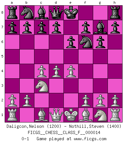 Last move : 0-1 2006 December 29 8:48:52 [Event "FICGS__CHESS__CLASS_F__000014"] [Site "FICGS"] [Date "2006.10.17"] [Round "1"] [White "Daligcon,Nelson"] [Black "Nothill,Steven"] [Result "0-1"] [WhiteElo "1200"] [BlackElo "1400"] 1.d4 Nf6 2.c4 g6 3.Nc3 Bg7 4.e4 e6 0-1 This chess game has been lost on time (started : 2006.10.17 9:6:58) King's Indian : 4.e4 Player Black won this chess game. Follow this game move after move (download)Chess is like life. (Boris Spassky) Privat ist Kortschnoi kein schlechter Mensch, sehr sympathisch. Aber während des Spiels ist er grausam. Er will dich töten. (Miguel Najdorf) Las piezas de Ajedrez son los bloques del alfabeto que moldean los pensamientos; y esos pensamientos, aunque hagan un diseño visual en el tablero, expresan abstractamente su belleza como un poema. (Marcel Duchamp) Les échecs, c'est la lutte contre l'erreur. (Johannes Zukertort) Horse racing is animated roulette. (Roger Kahn)