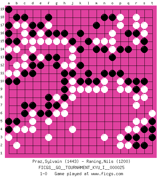 Last move : 1-0 2010 June 18 8:47:37 [Event "FICGS__GO__TOURNAMENT_KYU_I__000025"] [Site "FICGS"] [Date "2010.02.04"] [Round "1"] [Black "Praz,Sylvain"] [White "Raning,Nils"] [Result "1-0"] [Rating 1 "1443"] [Rating 2 "1200"] 1.r16 d4 2.d17 q4 3.c6 f3 4.c11 p17 5.m17 o16 6.q14 r18 7.r10 r7 8.k16 d15 9.f16 c17 10.c18 c16 11.b18 c12 12.d12 c13 13.d11 n3 14.f13 j4 15.o18 r17 16.q16 p18 17.r3 r4 18.q3 p3 19.s4 s5 20.s2 r5 21.t3 c4 22.e6 f5 23.f6 g6 24.f8 g8 25.g7 h7 26.f7 h6 27.h8 j8 28.h9 j9 29.h10 j10 30.h11 q9 31.r9 r8 32.q10 p9 33.j11 k11 34.o11 n9 35.m10 m9 36.l10 l9 37.k10 n10 38.n11 s16 39.s15 s17 40.b5 b4 41.a4 a3 42.a5 b2 43.n14 n15 44.m14 m15 45.l15 o14 46.o13 b11 47.b10 a11 48.a10 b12 49.p14 o15 50.a15 b17 51.a17 b14 52.a13 a14 53.a16 d14 54.d16 c15 55.d13 e16 56.e17 e15 57.b15 f15 58.g16 g15 59.h16 h15 60.j15 j14 61.k14 j13 62.g13 j12 63.k12 e13 64.e12 h12 65.g12 k9 66.l11 s9 67.s10 s8 68.n18 a18 69.a19 q2 70.r2 p2 71.t5 t6 72.t4 p10 73.p11 d6 74.d7 d5 75.c7 r15 76.s14 f17 77.f18 1-0 This go game has been lost on time (started : 2010.02.04 22:50:49) Here are the names of the openings (joseki) played in the four corners : Corner d4 : d4 c6 Hoshi (Hwajeom, Seongjeom, Xingwei`) 4-4 Point. The star or hoshi (4-4) point, emphasizing influence at the potential expense of territory. Ikken Kakari (Hankan Keolch'im, Yi Gua`jiao~, 1-Space Low Approach). Black 2 is the standard approach move to the 4-4. Corner q16 : r16 p17 Komoku (Somok, Xiao~mu`) 3-4 Point. The komoku (3-4) point is the traditional corner enclosure move.. Ikken Kakari (Hankan Keolch'im, Yi Gua`jiao~, 1-Space Low Pincer). The small knight move is the basic approach move to the 3-4 point stone. It has been continually used for over four centuries. There are limitless variations, with new moves constantly being discovered. White 2 opens the door to a treaure store of joseki. Player Black won this Go (weiqi, baduk) game. Follow this game move after move (download)Stop on second, extend on third. (Anonymous) They misunderestimated me. (George W. Bush, Bentonville nov. 6, 2000)