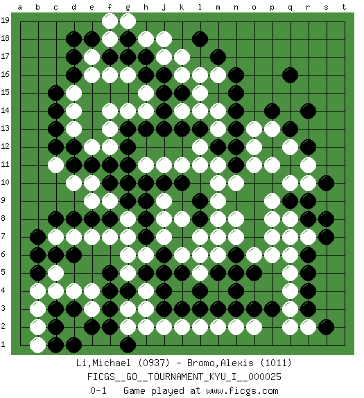 Last move : 0-1 2010 October 21 22:6:20 [Event "FICGS__GO__TOURNAMENT_KYU_I__000025"] [Site "FICGS"] [Date "2010.02.04"] [Round "1"] [Black "Li,Michael"] [White "Bromo,Alexis"] [Result "0-1"] [Rating 1 "0937"] [Rating 2 "1011"] 1.q16 d4 2.d16 q4 3.c6 c5 4.d6 d10 5.f3 e3 6.f4 k4 7.c3 b3 8.e2 d2 9.d3 e4 10.c2 c4 11.f5 b2 12.d1 b1 13.c1 q10 14.b5 b4 15.b6 g2 16.f2 g3 17.c12 c11 18.d12 e12 19.e11 e10 20.f11 f12 21.f10 f9 22.g12 f13 23.g13 f14 24.d11 d13 25.c13 d14 26.c14 d15 27.c15 e16 28.d17 e17 29.e18 f18 30.d18 f19 31.f17 f16 32.g17 g16 33.h17 j17 34.h16 h15 35.j16 k17 36.m17 k16 37.j15 h14 38.k15 l16 39.n15 l15 40.r3 q3 41.r4 r2 42.s2 q2 43.r5 q5 44.r6 q6 45.r8 q7 46.r9 r7 47.s7 q8 48.k13 k14 49.j14 l14 50.h13 g14 51.m12 l11 52.l13 m14 53.n14 h18 54.g18 j18 55.l18 g19 56.j13 m13 57.n13 l12 58.g9 e9 59.n11 m11 60.n12 g8 61.h9 j8 62.h8 g7 63.h7 g6 64.h5 h6 65.j6 g5 66.g4 h4 67.j5 j7 68.j4 h3 69.j3 j2 70.k3 k2 71.g1 h2 72.l3 l2 73.m3 m2 74.n3 n2 75.o3 o2 76.f8 f7 77.e8 e7 78.d8 d7 79.c8 c7 80.b7 j9 81.g10 k6 82.n9 n10 83.o10 m10 84.q9 p9 85.p10 r10 86.s8 m8 87.o7 o6 88.n7 n8 89.o8 p8 90.o9 p11 91.n6 n5 92.m5 m6 93.o5 p6 94.k5 l5 95.n4 m7 96.l9 m9 97.k10 k11 98.j10 h11 99.g11 j11 100.h10 o11 101.l4 l6 102.k7 k8 103.l8 l7 104.r14 p7 105.p3 n5 106.n6 n7 107.n5 m16 108.n16 o12 109.r12 q12 110.q13 p13 111.p14 o13 112.s10 r11 0-1 This go game has been lost on time (started : 2010.02.04 22:50:49) Here are the names of the openings (joseki) played in the four corners : Corner d4 : d4 c6 Hoshi (Hwajeom, Seongjeom, Xingwei`) 4-4 Point. The star or hoshi (4-4) point, emphasizing influence at the potential expense of territory. Ikken Kakari (Hankan Keolch'im, Yi Gua`jiao~, 1-Space Low Approach). Black 2 is the standard approach move to the 4-4. Corner q4 : q4 r3 Hoshi (Hwajeom, Seongjeom, Xingwei`) 4-4 Point. The star or hoshi (4-4) point, emphasizing influence at the potential expense of territory. Player White won this Go (weiqi, baduk) game. Follow this game move after move (download)Strange things happen at the one-two points. (Anonymous) Life is like a play: it's not the length but the excellence of the acting that matters. (Seneca)