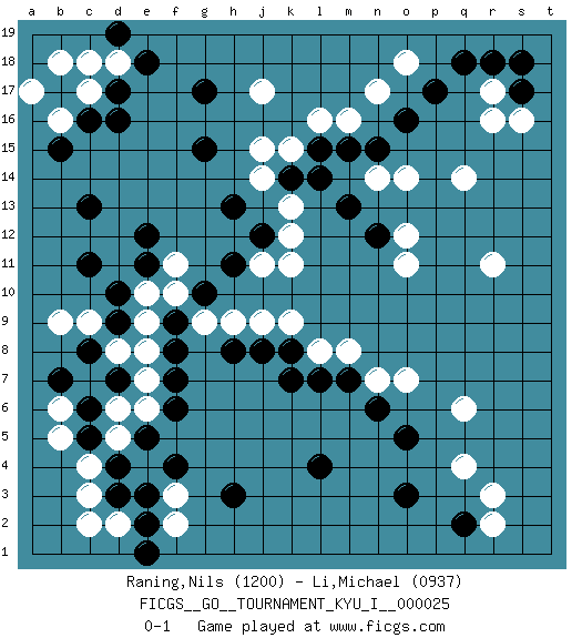 Last move : 0-1 2010 June 7 9:18:48 [Event "FICGS__GO__TOURNAMENT_KYU_I__000025"] [Site "FICGS"] [Date "2010.02.04"] [Round "1"] [Black "Raning,Nils"] [White "Li,Michael"] [Result "0-1"] [Rating 1 "1200"] [Rating 2 "0937"] 1.d16 q4 2.d4 r16 3.p17 m16 4.o16 q14 5.r18 r11 6.o3 q6 7.q2 r3 8.l4 f3 9.h3 c3 10.d3 c4 11.c5 d2 12.e2 c2 13.e3 f2 14.e1 d5 15.e5 d6 16.c6 c7 17.d7 e6 18.f6 e7 19.f4 b6 20.g17 n17 21.s17 r17 22.q18 s16 23.s18 o18 24.c13 o14 25.f7 e8 26.o5 j17 27.g15 c17 28.c16 o7 29.n6 n7 30.m7 m8 31.l7 l8 32.k7 j9 33.h13 k13 34.j12 k12 35.d9 b9 36.c8 d8 37.b7 c9 38.d7 b5 39.c11 b16 40.b15 b18 41.d17 d18 42.e18 a17 43.d19 c18 44.k8 k9 45.f8 e9 46.d10 r2 47.n15 n14 48.m15 l16 49.l15 k15 50.k14 j14 51.l14 j15 52.f9 e10 53.e11 f10 54.g10 f11 55.e12 j11 56.h11 k11 57.j8 h9 58.h8 g9 59.m13 o12 60.n12 o11 0-1 This go game has been lost on time (started : 2010.02.04 22:50:49) Here are the names of the openings (joseki) played in the four corners : Corner q16 : r16 p17 Komoku (Somok, Xiao~mu`) 3-4 Point. The komoku (3-4) point is the traditional corner enclosure move.. Ikken Kakari (Hankan Keolch'im, Yi Gua`jiao~, 1-Space Low Pincer). The small knight move is the basic approach move to the 3-4 point stone. It has been continually used for over four centuries. There are limitless variations, with new moves constantly being discovered. Black 2 opens the door to a treaure store of joseki. Corner q4 : q4 o3 Hoshi (Hwajeom, Seongjeom, Xingwei`) 4-4 Point. The star or hoshi (4-4) point, emphasizing influence at the potential expense of territory. Ikken Kakari (Hankan Keolch'im, Yi Gua`jiao~, 1-Space Low Approach). Black 2 is the standard approach move to the 4-4. Corner d4 : d4 f3 Hoshi (Hwajeom, Seongjeom, Xingwei`) 4-4 Point. The star or hoshi (4-4) point, emphasizing influence at the potential expense of territory. Ikken Kakari (Hankan Keolch'im, Yi Gua`jiao~, 1-Space Low Approach). White 2 is the standard approach move to the 4-4. Player White won this Go (weiqi, baduk) game. Follow this game move after move (download)Never try to cut bamboo joints. (Anonymous) A journey of a thousand sites begins with a single click. (Author unknown)