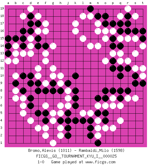 Last move : 1-0 2010 August 31 10:55:35 [Event "FICGS__GO__TOURNAMENT_KYU_I__000025"] [Site "FICGS"] [Date "2010.02.04"] [Round "1"] [Black "Bromo,Alexis"] [White "Rambaldi,Milo"] [Result "1-0"] [Rating 1 "1011"] [Rating 2 "1598"] 1.q16 d4 2.d16 q4 3.k10 k17 4.l17 l18 5.m17 f17 6.e17 f16 7.e15 e16 8.d10 d15 9.c16 d14 10.e14 d13 11.c15 f13 12.f14 g14 13.q10 e18 14.d17 b14 15.b15 b12 16.c14 c13 17.a14 b13 18.a13 a12 19.a15 c18 20.d18 d19 21.k4 c6 22.d7 c7 23.c8 d8 24.e8 o3 25.o5 q6 26.q7 p6 27.o7 q15 28.r16 r15 29.s16 s15 30.t16 r12 31.r11 s11 32.s10 q12 33.q11 p16 34.p17 o16 35.o17 g11 36.f10 g10 37.g9 h9 38.j9 h10 39.h8 f9 40.g8 e10 41.f11 e11 42.e9 f12 43.f8 e3 44.f4 p7 45.p8 o6 46.o8 n6 47.n5 k16 48.l16 m18 49.n18 l15 50.m15 n16 51.m16 n17 52.o18 m14 53.n15 n14 54.p15 o15 55.p14 p13 56.q14 s13 57.t15 t14 58.m19 f3 59.g3 g4 60.h4 g5 61.f5 h3 62.g2 h5 63.j4 h2 64.j3 f2 65.j2 g1 66.j5 f6 67.d9 m5 68.m4 n4 69.o4 n3 70.m3 n2 71.m2 l5 72.l4 t10 73.t9 t11 74.s9 q18 75.q17 s18 76.r18 r19 77.r17 r7 78.q8 j6 79.k6 j7 80.k7 j8 81.k8 h6 82.e5 b10 83.b9 b7 84.d6 c5 85.c10 b8 86.p12 o12 87.p11 q13 88.r8 s7 89.n1 p3 90.n7 1-0 This go game has been lost on time (started : 2010.02.04 22:50:49) Here are the names of the openings (joseki) played in the four corners : Corner d16 : d16 f17 Hoshi (Hwajeom, Seongjeom, Xingwei`) 4-4 Point. The star or hoshi (4-4) point, emphasizing influence at the potential expense of territory. Ikken Kakari (Hankan Keolch'im, Yi Gua`jiao~, 1-Space Low Approach). White 2 is the standard approach move to the 4-4. Player Black won this Go (weiqi, baduk) game. Follow this game move after move (download)If you don't know ladders, don't play go. (Anonymous) If you work for a living, why do you kill yourself working ? (Tuco to a chicken in The Good, The Bad and The Ugly)