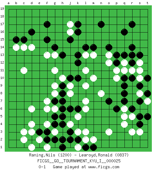 Last move : 0-1 2010 May 21 20:26:40 [Event "FICGS__GO__TOURNAMENT_KYU_I__000025"] [Site "FICGS"] [Date "2010.02.04"] [Round "1"] [Black "Raning,Nils"] [White "Learoyd,Ronald"] [Result "0-1"] [Rating 1 "1200"] [Rating 2 "0837"] 1.d16 d4 2.q16 q4 3.k16 d14 4.f17 c11 5.f3 d6 6.j3 l3 7.r6 o3 8.s4 r3 9.d2 c3 10.q10 c2 11.p6 k5 12.h5 e2 13.e3 d3 14.f2 d1 15.r14 f6 16.k2 l2 17.j6 l7 18.n17 j8 19.c15 c14 20.b15 b14 21.r17 q12 22.r12 r13 23.q13 r11 24.s13 q11 25.r10 s12 26.r13 s10 27.s9 p10 28.q8 s3 29.p12 p11 30.q9 o12 31.p13 o13 32.o14 m13 33.m14 l13 34.l14 n8 35.k13 l11 36.k12 m10 37.f15 f13 38.g14 g13 39.h13 g11 40.h7 g8 41.h8 g9 42.h9 h10 43.j10 j9 44.g7 f7 45.g5 g6 46.h6 j4 47.h4 k3 48.j2 t7 49.t10 s11 50.t5 r5 51.s5 q6 52.q7 q5 53.o7 j17 54.k17 j16 55.j15 s8 56.s7 t9 57.t8 f4 58.g4 k1 59.h2 j1 60.h1 g3 61.g2 f1 62.l1 k1 63.m1 m2 64.k6 l6 65.k10 l9 0-1 This go game has been lost on time (started : 2010.02.04 22:50:49) Here are the names of the openings (joseki) played in the four corners : Corner d16 : d16 d14 Hoshi (Hwajeom, Seongjeom, Xingwei`) 4-4 Point. The star or hoshi (4-4) point, emphasizing influence at the potential expense of territory. Ikken Takagakari (Hankan Nop'dakeolch'im, Yi Gaojia, 1-Space High Approach). Black typically responds at 6-4 or 3-10. Black 4-10 is played when Black finds play on the right side advantageous. Black 4-8 or 3-8 may be played when Black has support at top. Corner d4 : d4 f3 Hoshi (Hwajeom, Seongjeom, Xingwei`) 4-4 Point. The star or hoshi (4-4) point, emphasizing influence at the potential expense of territory. Ikken Kakari (Hankan Keolch'im, Yi Gua`jiao~, 1-Space Low Approach). Black 2 is the standard approach move to the 4-4. Player White won this Go (weiqi, baduk) game. Follow this game move after move (download)Go is to western chess what philosophy is to double entry accounting. (from Shibumi, by Trevanian) There is a great deal of difference between an eager man who wants to read a book and a tired man who wants a book to read. (G.K. Chesterton)