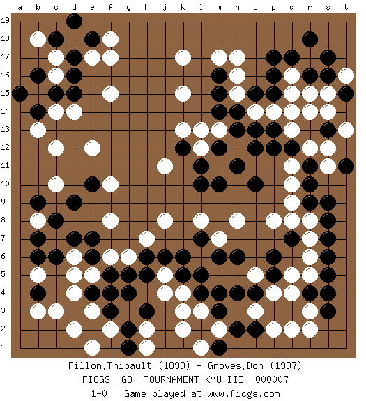 Last move : 1-0 2010 April 16 22:35:19 [Event "FICGS__GO__TOURNAMENT_KYU_III__000007"] [Site "FICGS"] [Date "2010.02.05"] [Round "1"] [Black "Pillon,Thibault"] [White "Groves,Don"] [Result "1-0"] [Rating 1 "1899"] [Rating 2 "1997"] 1.q17 e17 2.r4 d4 3.p3 r15 4.q12 n17 5.p16 k17 6.r16 q15 7.p15 k4 8.d15 c16 9.c15 c10 10.d16 c17 11.d17 d18 12.c18 b18 13.e18 f17 14.d19 f18 15.e10 c12 16.c6 g3 17.e6 e12 18.b4 c3 19.d9 b8 20.c8 b15 21.b14 b13 22.b16 f15 23.m3 l3 24.m4 r8 25.r10 p8 26.o10 r6 27.p6 n8 28.m16 n16 29.m15 n15 30.m14 k15 31.n14 m17 32.m10 l8 33.b9 c14 34.a15 d14 35.q7 o14 36.o15 p14 37.q14 q16 38.p17 r17 39.s16 r14 40.s17 q13 41.o13 r12 42.p13 q11 43.p12 q10 44.r11 s12 45.r9 q9 46.s8 r7 47.s7 s11 48.s9 q8 49.s6 r5 50.s5 q4 51.q3 p4 52.o4 o5 53.p5 q5 54.n6 r3 55.s4 o3 56.n4 q2 57.s3 r2 58.o2 p2 59.l2 k2 60.l4 k3 61.n2 l1 62.m1 m2 63.k5 j5 64.k6 s15 65.s13 t13 66.t11 t16 67.r18 j8 68.j6 q14 69.l10 s14 70.t15 l6 71.l5 h7 72.h6 g6 73.h5 j4 74.g5 f6 75.f5 e5 76.l7 m7 77.m6 l13 78.m12 n12 79.n11 m13 80.n13 l12 81.l11 j11 82.k12 m11 83.o12 k13 84.m12 d6 85.e7 f8 86.d7 b3 87.e4 d5 88.b7 f10 89.f3 b5 90.b6 e3 91.f4 f2 92.e2 d2 93.g2 e1 94.h3 h2 95.g1 h1 96.g4 1-0 Here are the names of the openings (joseki) played in the four corners : Corner q16 : q17 r15 Komoku (Somok, Xiao~mu`) 3-4 Point. The komoku (3-4) point is the traditional corner enclosure move.. Ikken Kakari (Hankan Keolch'im, Yi Gua`jiao~, 1-Space Low Pincer). The small knight move is the basic approach move to the 3-4 point stone. It has been continually used for over four centuries. There are limitless variations, with new moves constantly being discovered. White 2 opens the door to a treaure store of joseki. Corner d16 : e17 d15 Mokuhazushi (Waemok, Wai`mu`) 5-3 Point. The mokuhazushi (5-3) point was popular in the Edo period in Japan (1600 - 1867). It emphasizes influence; territorially, it is inferior to the 3-4 point. Takamoku Kakari. Black prevents White from gaining influence, but in the local context, abandoning profit in the corner entails a loss. White 3-4 and 4-4 are best. Corner d4 : d4 c6 Hoshi (Hwajeom, Seongjeom, Xingwei`) 4-4 Point. The star or hoshi (4-4) point, emphasizing influence at the potential expense of territory. Ikken Kakari (Hankan Keolch'im, Yi Gua`jiao~, 1-Space Low Approach). Black 2 is the standard approach move to the 4-4. Player Black won this Go (weiqi, baduk) game. Follow this game move after move (download)The poor player plays the opponent's game for him. (Anonymous) Creativity is allowing yourself to make mistakes. Art is knowing which ones to keep. (Scott Adams)