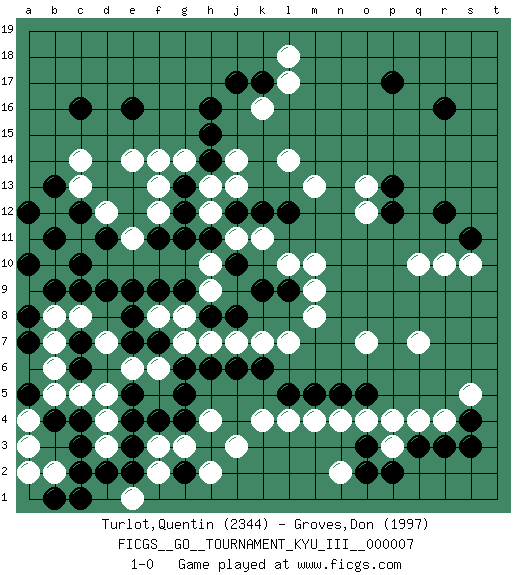 Last move : 1-0 2010 March 19 20:46:19 [Event "FICGS__GO__TOURNAMENT_KYU_III__000007"] [Site "FICGS"] [Date "2010.02.05"] [Round "1"] [Black "Turlot,Quentin"] [White "Groves,Don"] [Result "1-0"] [Rating 1 "2344"] [Rating 2 "1997"] 1.r16 d5 2.e16 q4 3.c9 c11 4.e9 c14 5.c16 e14 6.h16 q10 7.r12 k4 8.e3 g3 9.g2 h2 10.h3 f2 11.g4 f3 12.f4 j3 13.e2 h4 14.e4 e6 15.f7 f6 16.g6 g7 17.h6 g8 18.e7 e11 19.f9 r10 20.c4 c5 21.b4 b5 22.r3 d4 23.c2 q7 24.q3 p4 25.o2 d7 26.d9 b8 27.b9 c8 28.c6 j7 29.j6 h10 30.f11 f12 31.g11 b6 32.c7 f8 33.e8 k7 34.k6 h12 35.g9 h9 36.h11 j11 37.g12 h13 38.g13 g14 39.h14 j14 40.h15 f14 41.j12 j13 42.k12 k11 43.l12 l14 44.k9 l10 45.l9 m10 46.h8 h7 47.j8 l7 48.j10 m8 49.g5 m9 50.b11 b12 51.c10 a11 52.d11 b10 53.c12 d12 54.b11 a4 55.a10 b2 56.c3 a2 57.a5 a3 58.l5 l4 59.m5 m4 60.n5 c13 61.b1 n4 62.o5 c11 63.a12 k16 64.c12 r4 65.b13 o7 66.a8 b7 67.e5 d3 68.d2 o4 69.c1 e1 70.p17 m13 71.p12 o12 72.p13 o13 73.s11 s10 74.k17 l17 75.j17 f13 76.s4 s5 77.s3 n2 78.o3 p3 79.p2 l18 80.a7 1-0 Quentin Turlot thanks for the game Quentin Turlot yeah, a5 isn't realy needed but I wasn't sure if you counted the liberty left so... Here are the names of the openings (joseki) played in the four corners : Corner d4 : d5 c9 Takamoku (Gomok, Gaomu`) 5-4 Point. The takamoku (high) point (5-4). With its emphasis on influence, the 5-4 point complements the 4-4 (hoshi) point in creating an influence-oriented fuseki. Corner d16 : e16 c11 Takamoku (Gomok, Gaomu`) 5-4 Point. The takamoku (high) point (5-4). With its emphasis on influence, the 5-4 point complements the 4-4 (hoshi) point in creating an influence-oriented fuseki. Corner q4 : q4 r3 Hoshi (Hwajeom, Seongjeom, Xingwei`) 4-4 Point. The star or hoshi (4-4) point, emphasizing influence at the potential expense of territory. Player Black won this Go (weiqi, baduk) game. Follow this game move after move (download)In the opening, when you don't know what to play, make a shimari. (Jansteen) Over-the-board chess is the favorite of mortals, correspondence chess is the favorite of the gods. (Eduard Dyckhoff)