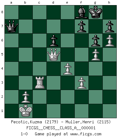 Last move : 1-0 2006 May 23 13:55:30 [Event "FICGS__CHESS__CLASS_A__000001"] [Site "FICGS"] [Date "2006.04.08"] [Round "1"] [White "Pecotic,Kuzma"] [Black "Muller,Henri"] [Result "1-0"] [WhiteElo "2179"] [BlackElo "2115"] 1.e4 c5 2.Nf3 d6 3.d4 cxd4 4.Nxd4 Nf6 5.Nc3 a6 6.Be3 e5 7.Nb3 Be6 8.Qd2 Nbd7 9.f3 Be7 10.g4 O-O 11.O-O-O Qc7 12.Kb1 Rfc8 13.Qf2 b5 14.g5 Nh5 15.h4 b4 16.Nd5 Bxd5 17.Rxd5 a5 18.Bh3 a4 19.Nc1 Rcb8 20.Bg4 Nf4 21.Bxf4 exf4 22.Bxd7 Qxd7 23.Nd3 b3 24.cxb3 axb3 25.a3 Rc8 26.Nxf4 Qa4 27.Rd4 Qa7 28.Rd2 Qa6 29.Nd5 Bd8 30.Rhd1 Qb5 31.Qd4 Rab8 32.Nc3 Qe8 33.Rd3 Rc6 34.Qa4 Be7 35.Rd4 Qc8 36.Nd5 Bf8 37.Rb4 Rxb4 38.axb4 Ra6 39.Qxb3 Qa8 40.b5 Ra1+ 41.Kc2 Ra5 42.b6 Qc6+ 43.Kb1 Rb5 44.Qa2 Rxd5 45.Qxd5 Qxb6 46.Rc1 Qa6 47.h5 g6 48.h6 Qa7 49.Rc3 1-0 Sicilian : Najdorf, Byrne (English) attack Kingside Castling by player Black (move 10) Queenside Castling by player White (move 11) Player White won this chess game. Follow this game move after move (download)At this time Fischer is simply a level above all the best Chessplayers in the world. (John Jacobs) Im Schach gibt es keinen Platz für Galanterie. (Irving Chernev) El Ajedrez era la lengua materna de Capablanca. (Reti) Il s'avisa de me proposer d'apprendre les échecs qu'il jouait un peu... me voilà forcené des échecs. J'achète un échiquier, je m'enferme dans ma chambre, j'y passe des jours et des nuits à vouloir apprendre par cur toutes les parties. (Jean-Jacques Rousseau, Confessions) SEO proverb : Make your website optimized for human beings, not for search engines.