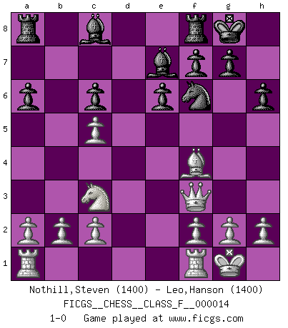 Last move : 1-0 2007 March 14 19:48:2 [Event "FICGS__CHESS__CLASS_F__000014"] [Site "FICGS"] [Date "2006.10.17"] [Round "1"] [White "Nothill,Steven"] [Black "Leo,Hanson"] [Result "1-0"] [WhiteElo "1400"] [BlackElo "1400"] 1.e4 d5 2.exd5 Qxd5 3.Nc3 Qe5+ 4.Be2 a6 5.Nf3 Qe6 6.d4 h6 7.O-O Nf6 8.Ne5 c5 9.Be3 Nc6 10.Nxc6 Qxc6 11.Bf4 e6 12.Bf3 Be7 13.Bxc6+ bxc6 14.dxc5 O-O 15.Qf3 1-0 Scandinavian (centre counter) defense Kingside Castling by player White (move 7) Kingside Castling by player Black (move 14) Player White won this chess game. Follow this game move after move (download)I thought the most common mistake [in chess] was the first one: Learning the game :P (Garvin Gray, FICGS forum) Wie, soll nun auch die Opposition abgeschafft werden? Ja, es tut mir leid, Ihnen diesen Schmerz nicht ersparen zu können. (Aaron Nimzowitsch) Cuando tu casa esta en llamas, no puedes ser molestado por tus vecinos. O, como decinos en Ajedrez, si tu Rey esta bajo ataque, no te preocupa perder un Peón del lado de la Reina. (Gary Kasparov) La menace est plus forte que l'exécution. (Aaron Nimzovitch) Hardware: the parts of a computer that can be kicked. (Jeff Persis)