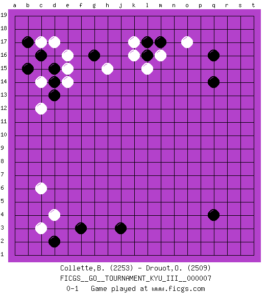 Last move : 0-1 2010 March 25 9:30:13 [Event "FICGS__GO__TOURNAMENT_KYU_III__000007 "] [Site "FICGS"] [Date "2010.02.05"] [Round "1"] [Black "Collette,Benjamin "] [White "Drouot,Olivier "] [Result "0-1"] [Rating 1 "2253"] [Rating 2 "2509"] 1.q16 d4 2.q4 e16 3.f3 c6 4.d2 c3 5.j3 o17 6.q14 k16 7.c16 c14 8.d15 c17 9.b17 d17 10.b15 c12 11.g16 e15 12.d14 e14 13.d13 h15 14.m17 m16 15.l16 l15 16.l17 k17 0-1 This go game has been lost on time (started : 2010.02.05 0:53:3) Here are the names of the openings (joseki) played in the four corners : Corner d4 : d4 f3Hoshi (Hwajeom, Seongjeom, Xingwei`) 4-4 Point. The star or hoshi (4-4) point, emphasizing influence at the potential expense of territory.Ikken Kakari (Hankan Keolch'im, Yi Gua`jiao~, 1-Space Low Approach). Black 2 is the standard approach move to the 4-4. Corner q16 : q16 o17Hoshi (Hwajeom, Seongjeom, Xingwei`) 4-4 Point. The star or hoshi (4-4) point, emphasizing influence at the potential expense of territory.Ikken Kakari (Hankan Keolch'im, Yi Gua`jiao~, 1-Space Low Approach). White 2 is the standard approach move to the 4-4. Corner d16 : e16 c16Takamoku (Gomok, Gaomu`) 5-4 Point. The takamoku (high) point (5-4). With its emphasis on influence, the 5-4 point complements the 4-4 (hoshi) point in creating an influence-oriented fuseki.Komoku. White responds with 3-3, 3-5, 4-6, 4-7, 3-6, 3-7. Player White won this Go (weiqi, baduk) game.Follow this game move after move (download ) When you study joseki, you lose two stones in strength. (Anonymous) The arrogant army will lose certainly the battle. (Chinese proverb)