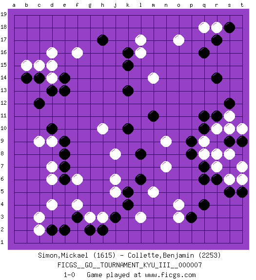 Last move : 1-0 2010 May 23 8:35:28 [Event "FICGS__GO__TOURNAMENT_KYU_III__000007 "] [Site "FICGS"] [Date "2010.02.05"] [Round "1"] [Black "Simon,Mickael "] [White "Collette,Benjamin "] [Result "1-0"] [Rating 1 "1615"] [Rating 2 "2253"] 1.q16 d4 2.q4 d16 3.q10 o17 4.r14 q18 5.r17 l17 6.f3 d6 7.d2 c3 8.j3 o3 9.p3 o4 10.r6 l3 11.c14 d14 12.d13 c15 13.e14 d15 14.e13 f16 15.b14 c9 16.h17 b15 17.k16 l16 18.k15 m14 19.k13 r18 20.s18 c2 21.c12 j5 22.k4 m5 23.k5 j6 24.l6 n7 25.l8 j8 26.k10 n9 27.m11 r8 28.q7 s6 29.s5 q8 30.p8 s10 31.r11 s11 32.s12 r10 33.q11 q9 34.p9 r7 35.q6 t7 36.s9 s8 37.t9 t10 38.t5 t6 39.d10 d9 40.e9 h10 41.e8 f6 42.e7 d7 43.e6 f4 44.e2 g3 45.g2 h3 46.h2 1-0 This go game has been lost on time (started : 2010.02.05 0:53:3) Here are the names of the openings (joseki) played in the four corners : Corner q16 : q16 o17Hoshi (Hwajeom, Seongjeom, Xingwei`) 4-4 Point. The star or hoshi (4-4) point, emphasizing influence at the potential expense of territory.Ikken Kakari (Hankan Keolch'im, Yi Gua`jiao~, 1-Space Low Approach). White 2 is the standard approach move to the 4-4. Corner d4 : d4 f3Hoshi (Hwajeom, Seongjeom, Xingwei`) 4-4 Point. The star or hoshi (4-4) point, emphasizing influence at the potential expense of territory.Ikken Kakari (Hankan Keolch'im, Yi Gua`jiao~, 1-Space Low Approach). Black 2 is the standard approach move to the 4-4. Corner q4 : q4 o3Hoshi (Hwajeom, Seongjeom, Xingwei`) 4-4 Point. The star or hoshi (4-4) point, emphasizing influence at the potential expense of territory.Ikken Kakari (Hankan Keolch'im, Yi Gua`jiao~, 1-Space Low Approach). White 2 is the standard approach move to the 4-4. Corner d16 : d16 c14Hoshi (Hwajeom, Seongjeom, Xingwei`) 4-4 Point. The star or hoshi (4-4) point, emphasizing influence at the potential expense of territory.Ikken Kakari (Hankan Keolch'im, Yi Gua`jiao~, 1-Space Low Approach). Black 2 is the standard approach move to the 4-4. Player Black won this Go (weiqi, baduk) game.Follow this game move after move (download ) The strong player plays straight, the weak diagonally. (Anonymous) Knowledge rests not upon truth alone, but upon error also. (Carl G. Jung)