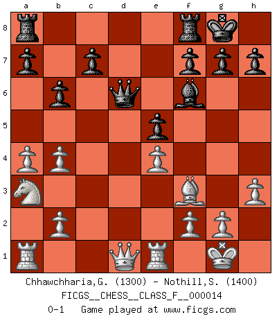 Last move : 0-1 2007 March 1 6:11:19 [Event "FICGS__CHESS__CLASS_F__000014"] [Site "FICGS"] [Date "2006.10.17"] [Round "1"] [White "Chhawchharia,Gaurav"] [Black "Nothill,Steven"] [Result "0-1"] [WhiteElo "1300"] [BlackElo "1400"] 1.e4 e5 2.Nf3 Nc6 3.d3 Nf6 4.Bg5 Be7 5.Bxf6 Bxf6 6.a4 O-O 7.Be2 d5 8.O-O b6 9.Re1 dxe4 10.dxe4 Nb4 11.Na3 Bg4 12.h3 Bxf3 13.Bxf3 Qd4 14.c3 Qd3 15.cxb4 Qd6 0-1 This chess game has been lost on time (started : 2006.10.17 9:6:58) King's pawn game Kingside Castling by player Black (move 6) Kingside Castling by player White (move 8) Player Black won this chess game. Follow this game move after move (download)Chess holds its master in its own bonds, shackling the mind and brain so that the inner freedom of the very strongest must suffer. (Albert Einstein) Die Idee von Capablanca, Schach als Fach in den Schulen zu lehren, ist großartig. (Fidel Castro) Bendita sea la memoria de aquel que dio al mundo este juego inmortal. (A. G. Gardiner) Il vaut mieux sacrifier les pièces de l'adversaire. (Xavier Tartacover) Coffee just isn't my cup of tea. (Unknown)