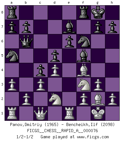 Last move : 1/2-1/2 2010 February 17 22:45:48 [Event "FICGS__CHESS__RAPID_A__000076"] [Site "FICGS"] [Date "2010.02.07"] [Round "1"] [White "Panov,Dmitriy"] [Black "Bencheikh,Ilf"] [Result "1/2-1/2"] [WhiteElo "1965"] [BlackElo "2098"] 1.e4 e6 2.d4 d5 3.e5 c5 4.c3 Nc6 5.Nf3 Qb6 6.a3 c4 7.Qc2 f6 8.exf6 Nxf6 9.Bf4 Be7 10.g3 O-O 11.Bg2 Bd7 12.O-O Be8 13.Re1 Bg6 14.Qc1 Na5 15.Nbd2 Bf5 16.Nh4 Bd3 17.Nhf3 Bf5 18.Nh4 Bd3 19.Nhf3 Bf5 1/2-1/2 French : Advance, Paulsen attack Kingside Castling by player Black (move 10) Kingside Castling by player White (move 12) This chess game ended in a draw. Follow this game move after move (download)The most important feature of the Chess position is the activity of the pieces. This is absolutely fundamental in all phases of the game: Opening, Middlegame and especially Endgame. The primary constraint on a piece's activity is the Pawn structure. (Michael Stean) Wie kann ich Remis annehmen? Ich weiß ja gar nicht, wie ich stehe! (Fritz Sämisch) Nada excita más a Grandes Maestros aburridos que una novedad teórica. (Dominic Lawson) Ce qui est bien, c'est d'avoir tout un tas de pièces en prise : l'adversaire ne peut en prendre qu'une à la fois. Cité par Thierry Audin. Without deviation from the norm, progress is not possible. (Frank Zappa)