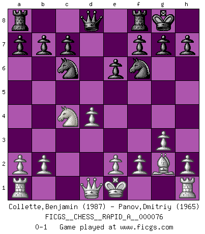 Last move : 0-1 2010 March 24 21:26:37 [Event "FICGS__CHESS__RAPID_A__000076"] [Site "FICGS"] [Date "2010.02.07"] [Round "1"] [White "Collette,Benjamin"] [Black "Panov,Dmitriy"] [Result "0-1"] [WhiteElo "1987"] [BlackElo "1965"] 1.c4 Nf6 2.g3 e6 3.Bg2 d5 4.d4 Bb4+ 5.Bd2 Bxd2+ 6.Nxd2 O-O 7.Ngf3 dxc4 8.Nxc4 Bd7 9.Nfe5 Bc6 10.Nxc6 Nxc6 0-1 This chess game has been lost on time (started : 2010.02.07 16:30:56) English, 1...Nf6 (Anglo-Indian defense) Kingside Castling by player Black (move 6) Player Black won this chess game. Follow this game move after move (download)Chess is a more highly symbolic game, but the aggressions are therefore even more frankly represented in the play. It probably began as a war game; that is, the representation of a miniature battle between the forces of two kingdoms. (Karl Meninger) Vielleicht wirkt die Aura früherer Spieler glanzvoller als die der heutigen Spieler, aber das liegt daran, dass man kein Programm wie Fritz hatte, das einem all die Löcher in ihren Partien zeigt. (Vladimir Kramnik) Después de una mala apertura, hay una esperanza en el juego medio. Pero una vez que estas en finales, el momento de la verdad ha llegado. (Edmar Mednis) 'L'échange des dames est un coup dur pour les deux adversaires...' Un journaliste lors d'une partie du match Spassky-Fischer It's only after you lost everything, Tyler says, that you're free to do anything. (Chuck Palahniuk, Fight Club)