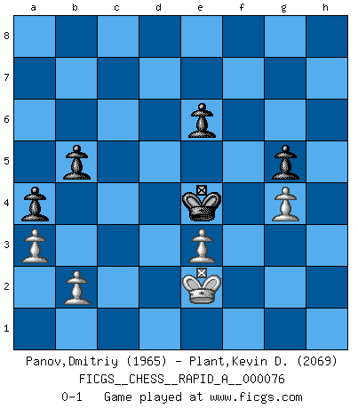 Last move : 0-1 2010 May 18 15:13:19 [Event "FICGS__CHESS__RAPID_A__000076"] [Site "FICGS"] [Date "2010.02.07"] [Round "1"] [White "Panov,Dmitriy"] [Black "Plant,Kevin D."] [Result "0-1"] [WhiteElo "1965"] [BlackElo "2069"] 1.e4 c5 2.c3 Nf6 3.e5 Nd5 4.d4 cxd4 5.cxd4 d6 6.Nf3 e6 7.Bc4 Nc6 8.O-O Be7 9.Qe2 O-O 10.Qe4 Qc7 11.a3 dxe5 12.dxe5 Rd8 13.h3 Na5 14.Ba2 Bd7 15.Bd2 Rac8 16.Nc3 Bc6 17.Nxd5 Bxd5 18.Bxd5 Rxd5 19.Bxa5 Rxa5 20.Rfd1 Rc5 21.Rd2 Rd8 22.Rad1 Rc1 23.Rxd8+ Bxd8 24.Qe1 Rxd1 25.Qxd1 h6 26.Qd2 Be7 27.g3 a5 28.Kg2 a4 29.Qd4 Qc6 30.Qd2 b5 31.Qd4 f6 32.Qa7 Kf8 33.Qe3 fxe5 34.Kg1 e4 35.Ne5 Qd5 36.Ng6+ Kf7 37.Nxe7 Kxe7 38.Qf4 Qf5 39.Qc7+ Kf6 40.Qd8+ Kg6 41.Qe8+ Kh7 42.g4 Qe5 43.Qd7 h5 44.Qd2 e3 45.Qe2 Qf4 46.Qxe3 Qxe3 47.fxe3 hxg4 48.hxg4 Kg6 49.Kg2 Kf6 50.Kf2 Ke5 51.Kf3 g5 52.Ke2 Ke4 0-1 Sicilian : Alapin's variation (2.c3) Kingside Castling by player White (move 8) Kingside Castling by player Black (move 9) 10 pieces endgame at move 48 : White KPPPP , Black KPPPP WHITE : King + 4 Pawns BLACK : King + 4 Pawns Player Black won this chess game. Follow this game move after move (download)All my games are real. (Bobby Fischer) Wenn ich Weiß habe gewinne ich weil ich Weiß habe, wenn ich Schwarz habe gewinne ich weil ich Bogoljubov bin. (Efim Bogoljubov) Fischer es el jugador mas fuerte del mundo. De hecho, el jugador mas fuerte que jamas haya existido. (Larry Evans) On entre au jeu d'Echecs comme on entre en Religion. Pour le joueur d'Echecs, la partie d'Echecs c'est l'office, la messe, le défilé du 1er Mai, le dépôt de gerbe au Monument aux Morts. C'est un drame sacré. (Michel Roos) The leaves of memory seemed to make a mournful rustling in the dark. (Henry Wadsworth Longfellow)