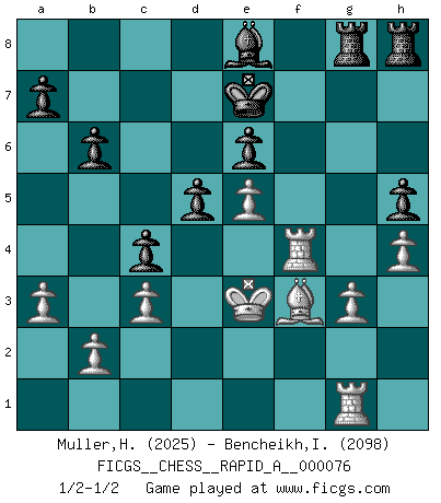 Last move : 1/2-1/2 2010 February 23 8:59:25 [Event "FICGS__CHESS__RAPID_A__000076"] [Site "FICGS"] [Date "2010.02.07"] [Round "1"] [White "Muller,Henri-Louis"] [Black "Bencheikh,Ilf"] [Result "1/2-1/2"] [WhiteElo "2025"] [BlackElo "2098"] 1.e4 e6 2.d4 d5 3.Nc3 Nc6 4.Nf3 Nf6 5.e5 Ne4 6.Bd3 Bb4 7.Bd2 Nxd2 8.Qxd2 Bd7 9.a3 Be7 10.O-O g5 11.Qe3 g4 12.Nd2 Bg5 13.Qe2 Qe7 14.f4 gxf3 15.Nxf3 Bh6 16.Nd1 O-O-O 17.Ne3 Rdg8 18.c3 f5 19.exf6 Qxf6 20.Ne5 Bxe3+ 21.Qxe3 Qg7 22.g3 Nxe5 23.Qxe5 Qxe5 24.dxe5 h5 25.Rf4 c5 26.Kf2 Kd8 27.h4 Ke7 28.Be2 c4 29.Rg1 Be8 30.Ke3 b6 31.Bd1 Rg7 32.Bf3 R7g8 1/2-1/2 French : Paulsen variation Kingside Castling by player White (move 10) Queenside Castling by player Black (move 16) This chess game ended in a draw. Follow this game move after move (download)Chess is imagination. (David Bronstein) Das Spiel gibt uns die Genugtuung, die das Leben uns versagt. (Emanuel Lasker) Te sientas frente a un tablero y repentinamente tu corazón brinca. Tu mano tiembla al tomar una pieza y moverla. Pero lo que el Ajedrez te enseña es que tu debes permanecer ahí con calma y pensar de que si realmente es una buena idea o de que si hay otras ideas mejores. (Stanley Kubrick) L'action d'une oeuvre littéraire se déroule sur un champ de bataille. Les masques et les types du drame moderne correspondent aux pièces du jeu d'échecs. L'intrigue correspond aux coups et aux gambits, c'est à dire aux techniques du jeu telles qu'utilisées et interprétées par les joueurs. Les tactiques et les péripéties [mouvements] correspondent aux coups exécutés par l'adversaire. (Viktor Shklovsky) It's not the will to win, but the will to prepare to win that makes the difference. (Bear Bryant)