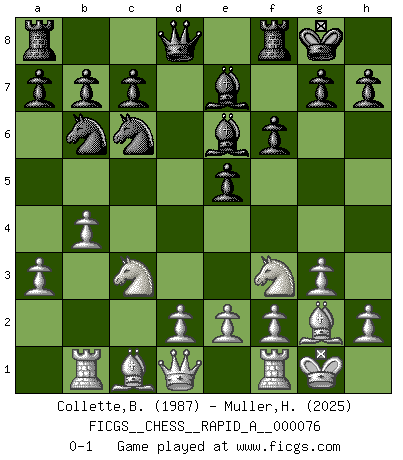 Last move : 0-1 2010 March 23 9:25:5 [Event "FICGS__CHESS__RAPID_A__000076"] [Site "FICGS"] [Date "2010.02.07"] [Round "1"] [White "Collette,Benjamin"] [Black "Muller,Henri-Louis"] [Result "0-1"] [WhiteElo "1987"] [BlackElo "2025"] 1.c4 Nf6 2.g3 e5 3.Bg2 d5 4.cxd5 Nxd5 5.Nc3 Nb6 6.Nf3 Nc6 7.O-O Be7 8.a3 O-O 9.b4 Be6 10.Rb1 f6 0-1 This chess game has been lost on time (started : 2010.02.07 16:30:56) English, 1...Nf6 (Anglo-Indian defense) Kingside Castling by player White (move 7) Kingside Castling by player Black (move 8) Player Black won this chess game. Follow this game move after move (download)Everything is in a state of flux, and this includes the world of Chess. (Mikhail Botvinnik) Ich brauche nur einen Blick auf das Schachbrett zu werfen, und weiß schon, was in der Stellung steckt, was geschehen kann und was geschehen wird. Alle übrigen suchen und prüfen, ich aber weiß es! (José Raúl Capablanca) Mis oponentes también hacen buenas movidas. A veces yo no tomo esas cosas en consideración. (Bobby Fischer) Le jeu d'échecs est comme rejeté hors du temps. (Antoine de Saint-Exupéry) Plans are ideas that never come to fruition. (Daniel Parmet)