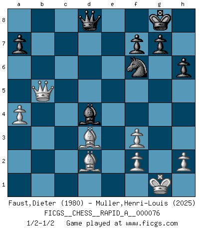 Last move : 1/2-1/2 2010 March 5 17:49:28 [Event "FICGS__CHESS__RAPID_A__000076"] [Site "FICGS"] [Date "2010.02.07"] [Round "1"] [White "Faust,Dieter"] [Black "Muller,Henri-Louis"] [Result "1/2-1/2"] [WhiteElo "1980"] [BlackElo "2025"] 1.d4 Nf6 2.c4 e6 3.Nc3 Bb4 4.Nf3 d5 5.cxd5 exd5 6.a3 Be7 7.e3 O-O 8.Bd3 b6 9.b4 c5 10.dxc5 bxc5 11.bxc5 Bxc5 12.O-O Be6 13.Bd2 Nbd7 14.Qc2 Qe7 15.Rfb1 Rab8 16.a4 Bg4 17.Rxb8 Rxb8 18.Rb1 Rxb1+ 19.Qxb1 Bxf3 20.gxf3 d4 21.exd4 Bxd4 22.Qb7 Qd8 23.Ne4 Nxe4 24.Qxe4 Nf6 25.Qb7 h6 26.Qb5 1/2-1/2 Nimzo-Indian : Three knights variation Kingside Castling by player Black (move 7) Kingside Castling by player White (move 12) This chess game ended in a draw. Follow this game move after move (download)Not only will I predict his triumph over Botvinnik, but I'll go further and say that he'll probably be the greatest Chess player that ever lived. (John Collins) Jeder leidlich begabte Spieler, er braucht keineswegs hervorragend veranlagt zu sein, kann es zum Meister bringen. Aber das ist ja auch gar nicht nötig! Der richtige Standpunkt ist es, zu seinem Vergnügen zu spielen, und man glaube ja nicht, dass der Genuss proportional dem Können sei. (Siegbert Tarrasch) El Ajedrez, como cualquier actividad creativa, solo puede existir a través del esfuerzo combinado de aquellos que tienen talento creativo y de aquellos que poseen la habilidad de organizar su trabajo creativo. (Mikhail Botvinnik) Que feriez-vous si vous étiez en train de jouer aux échecs et que la fin du monde arrive ? Je continuerais à jouer. (Saint Borromée) Success without honor is an unseasoned dish; it will satisfy your hunger, but it won't taste good. (Joe Paterno)