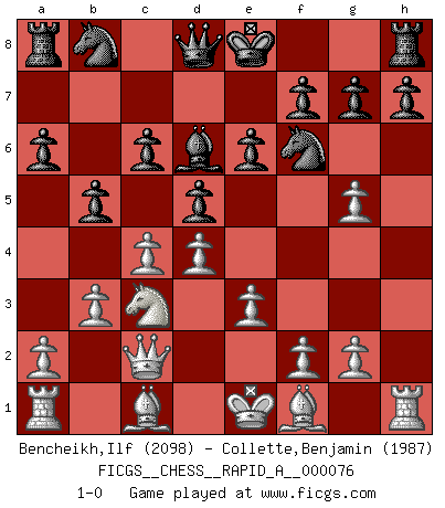 Last move : 1-0 2010 March 28 22:41:51 [Event "FICGS__CHESS__RAPID_A__000076"] [Site "FICGS"] [Date "2010.02.07"] [Round "1"] [White "Bencheikh,Ilf"] [Black "Collette,Benjamin"] [Result "1-0"] [WhiteElo "2098"] [BlackElo "1987"] 1.d4 d5 2.c4 c6 3.Nc3 Nf6 4.e3 a6 5.b3 b5 6.Qc2 Bg4 7.Nge2 e6 8.Ng3 Bd6 9.h3 Bxg3 10.hxg4 Bd6 11.g5 1-0 This chess game has been lost on time (started : 2010.02.07 16:30:56) QGD Slav defense Player White won this chess game. Follow this game move after move (download)It was clear to me that the vulnerable point of the American Grandmaster (Bobby Fischer) was in double-edged, hanging, irrational positions, where he often failed to find a win even in a won position. (Efim Geller) Wenn du auf das Glück wartest, wird das Leben ziemlich langweilig. (Mikhail Nekhemyevich Tal) El Ajedrez expande y enriquece tu mente. (Saudin Robovic) Des points faibles ou des trous dans la position de l'adversaire doivent être occupés par des pièces et non pas par des pions. (Siegbert Tarrasch) As the days dwindle down... to a precious few. (Maxwell Anderson)