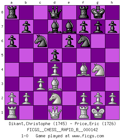 Last move : 1-0 2010 April 1 8:25:33 [Event "FICGS__CHESS__RAPID_B__000142"] [Site "FICGS"] [Date "2010.02.09"] [Round "1"] [White "Dikant,Christophe"] [Black "Price,Eric"] [Result "1-0"] [WhiteElo "1745"] [BlackElo "1726"] 1.d4 e6 2.Nf3 Nf6 3.Bf4 c5 4.e3 Nc6 5.c3 cxd4 6.exd4 d5 7.Bd3 Be7 8.Nbd2 a6 9.O-O O-O 10.Ne5 Bd7 11.Ng4 1-0 This chess game has been lost on time (started : 2010.02.09 16:4:51) Queen's pawn Kingside Castling by player White (move 9) Kingside Castling by player Black (move 9) Player White won this chess game. Follow this game move after move (download)If your opponent offers you a draw, try to work out why he thinks he's worse off. (Nigel Short) Es tut gut, die Entwicklungsperiode von, [...] demokratischem Geist durchdringen zu lassen. Wie undemokratisch wäre es doch beispielsweise, den einen Offizier große Spaziertouren vornehmen zu lassen, während die anderen zu Hause säßen und sich entsetzlich langweilten. (Aaron Nimzowitsch) La vida es como el Ajedrez, con lucha, competición y eventos buenos y malos. (Benjamin Franklin) Les échecs, c'est l'imagination. (David Bronstein) Optimism is a variety of information deficit. Sometimes especially true for correspondence chess games. (Michael Aigner)