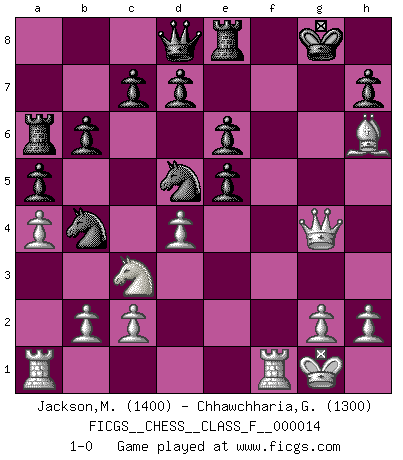 Last move : 1-0 2007 February 22 5:30:39 [Event "FICGS__CHESS__CLASS_F__000014"] [Site "FICGS"] [Date "2006.10.17"] [Round "1"] [White "Jackson,Marc"] [Black "Chhawchharia,Gaurav"] [Result "1-0"] [WhiteElo "1400"] [BlackElo "1300"] 1.f4 Nf6 2.Nf3 e6 3.e3 a5 4.a4 Nc6 5.Nc3 Bd6 6.Bb5 Nb4 7.O-O O-O 8.d4 b6 9.e4 Ba6 10.Bxa6 Rxa6 11.e5 Bxe5 12.fxe5 Nfd5 13.Bg5 f6 14.exf6 gxf6 15.Bh6 Re8 16.Ne5 fxe5 17.Qg4+ 1-0 This chess game has been lost on time (started : 2006.10.17 9:6:58) Comment by player 2 : Gaurav Chhawchharia : Shit!.. How come i didnt see this.. Bird's Opening Kingside Castling by player White (move 7) Kingside Castling by player Black (move 7) Player White won this chess game. Follow this game move after move (download)The stomach is an essential part of the Chess master. (Bent Larsen) Ein Schachgenie ist jemand der verdammt gut Schach spielt. (Jonathan Levitt) Por tratar de evitar la pérdida de una pieza, muchas personas han perdido una partida de Ajedrez. (Savielly Tartakover) Il n'y a pas eu de défaite parce que je ne crois pas que cet ordinateur ait jamais existé. IBM a triché en refusant d'imprimer les modes de recherche de la machine. C'est évident, pendant le match, des coups décisifs ont été joués par des êtres humains. Aujourd'hui, les meilleurs spécialistes en informatique ne peuvent toujours pas expliquer comment Deep-Blue a pu jouer contre la logique des ordinateurs. IBM a gagné une guerre de communication, mais ils sont incapables de prouver que l'ordinateur a gagné tout seul. (Garry Kasparov) Fame, I have already. Now I need the money. (an elderly Steinitz)