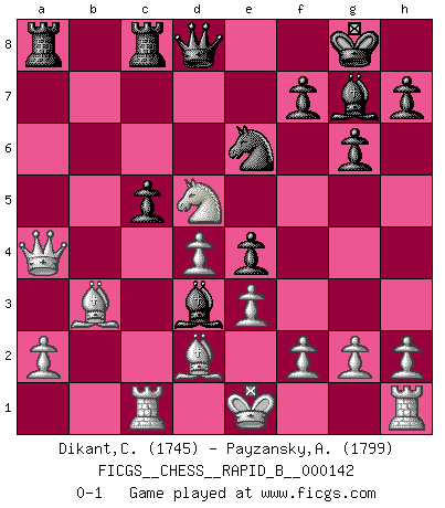 Last move : 0-1 2010 March 12 13:48:32 [Event "FICGS__CHESS__RAPID_B__000142"] [Site "FICGS"] [Date "2010.02.09"] [Round "1"] [White "Dikant,Christophe"] [Black "Payzansky,Aleksey"] [Result "0-1"] [WhiteElo "1745"] [BlackElo "1799"] 1.c4 Nf6 2.Nc3 d5 3.d4 g6 4.e3 Bg7 5.Nf3 O-O 6.c5 b6 7.b4 bxc5 8.bxc5 c6 9.Qa4 a5 10.Ne5 Qc7 11.Bd3 Nfd7 12.Nxd7 Nxd7 13.Ne2 e5 14.Bd2 e4 15.Bc2 Nxc5 16.Qa3 Ne6 17.Rc1 Ba6 18.Ba4 c5 19.Nc3 Rfc8 20.Nxd5 Qd8 21.Bb3 a4 22.Qxa4 Bd3 0-1 English : Anglo-Gruenfeld defense Kingside Castling by player Black (move 5) Player Black won this chess game. Follow this game move after move (download)Bobby Fischer is the greatest Chess genius of all time ! (Alexander Kotov) Ein Großmeister muß tausende Partien in seinem Kopf speichern, denn diese sind für Ihn, was die Worte der Muttersprache für gewöhnliche Leute sind, oder Noten für Musiker... (Garry Kasparov) Aún el Rey más flojo huye despavorido ante la amenaza de un Jaque doble. (Aaron Nimzowitsch) Les Echecs représentent une sphère d'idées créatrices basée sur la volonté des deux protagonistes. (Smyslov) A specialist learns more and more about less and less until he knows everything about nothing. (Nicholas Murray Butler)