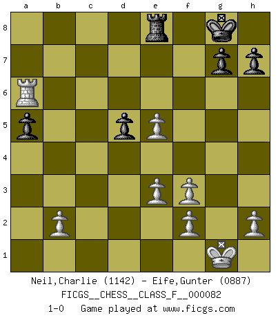 Last move : 1-0 2010 July 4 17:28:23 [Event "FICGS__CHESS__CLASS_F__000082"] [Site "FICGS"] [Date "2010.02.11"] [Round "1"] [White "Neil,Charlie"] [Black "Eife,Gunter"] [Result "1-0"] [WhiteElo "1142"] [BlackElo "0887"] 1.d4 Nf6 2.c4 e6 3.Nf3 Bb4+ 4.Bd2 Bxd2+ 5.Nbxd2 Nc6 6.e3 O-O 7.Bd3 d5 8.O-O Qe7 9.Rc1 Bd7 10.cxd5 exd5 11.Re1 Nb4 12.Bb1 Bb5 13.Nb3 Rfe8 14.Nc5 b6 15.Nb3 a5 16.a3 Nc6 17.Qc2 Bc4 18.Nbd2 Bb5 19.a4 Nb4 20.Qxc7 Qxc7 21.Rxc7 Bxa4 22.Ne5 Nc2 23.Bxc2 Bxc2 24.Rc1 Bf5 25.Rxf7 Be6 26.Rb7 Ng4 27.Rxb6 Nxe5 28.dxe5 Rab8 29.R1c6 Rxb6 30.Rxb6 Bf5 31.Nf3 Be4 32.Ra6 Bxf3 33.gxf3 1-0 Bogo-Indian defense Kingside Castling by player Black (move 6) Kingside Castling by player White (move 8) Player White won this chess game. Follow this game move after move (download)The isolated Pawn casts gloom over the entire chessboard. (Aaron Nimzovich) Ich weiss nicht was Gott gegen mich auf 1.e4 antworten würde. (Robert James Fischer) Solo existe una cosa que Fischer hace en el Ajedrez sin placer: ¡perder!. (Boris Spassky) Des combinaisons [dans le jeu d'échecs] pareilles à des mélodies. Je crois entendre pour ainsi dire la musique des coups... (Vladimir Nabokov) Industry executives and analysts often mistakenly talk about strategy as if it were some kind of chess match. But in chess, you have just two opponents, each with identical resources, and with luck playing a minimal role. The real world is much more like a poker game, with multiple players trying to make the best of whatever hand fortune has dealt them. In our industry, Bill Gates owns the table until someone proves otherwise. (David Moschella, 'Computerworld')
