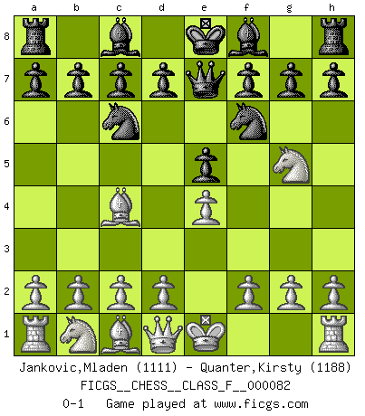 Last move : 0-1 2010 March 25 9:30:13 [Event "FICGS__CHESS__CLASS_F__000082"] [Site "FICGS"] [Date "2010.02.11"] [Round "1"] [White "Jankovic,Mladen"] [Black "Quanter,Kirsty"] [Result "0-1"] [WhiteElo "1111"] [BlackElo "1188"] 1.e4 e5 2.Nf3 Nc6 3.Bc4 Nf6 4.Ng5 Qe7 0-1 This chess game has been lost on time (started : 2010.02.11 19:51:18) Two knights defense Player Black won this chess game. Follow this game move after move (download)The passed pawn is a criminal, who should be kept under lock and key. Mild measures, such as police surveillance, are not sufficient. (Nimzovitch) Ich verachte Kasparow. (Viktor Kortschnoi) El juego de Fischer siempre fue nítido, racional y brillante. Uno de los mejores por siempre. (Dave Regis) Shah mat. Le roi est mort. Cri de fierté d'un joueur venant de terrasser son adversaire, courtoisement, sans effusion de sang. Beep ! (R2D2 in Star Wars ep.3)