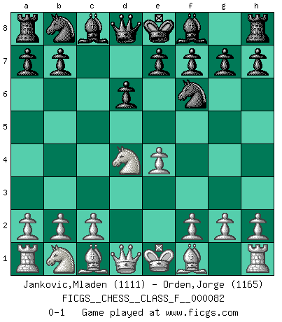 Last move : 0-1 2010 March 26 21:33:12 [Event "FICGS__CHESS__CLASS_F__000082"] [Site "FICGS"] [Date "2010.02.11"] [Round "1"] [White "Jankovic,Mladen"] [Black "Orden,Jorge"] [Result "0-1"] [WhiteElo "1111"] [BlackElo "1165"] 1.e4 c5 2.Nf3 d6 3.d4 cxd4 4.Nxd4 Nf6 0-1 This chess game has been lost on time (started : 2010.02.11 19:51:18) Sicilian Player Black won this chess game. Follow this game move after move (download)It is not a move, even the best move that you must seek, but a realizable plan. (Eugene Znosko-Borovsky) Herr Iljumschinow ist ein etwas merkwürdiger Geschäftsmann: Er arbeitet zusammen mit Leuten wie Muammar al-Gaddafi; früher ist das Saddam Hussein gewesen. (Joel Lautier) El Ajedrez por encima de todo... ¡es una pelea!. (Emanuel Lasker) Aidez vos pièces, elles vous aideront. (Paul Morphy) Beta. Software undergoes beta testing shortly before it's released. Beta is latin for still doesn't work. (Anonymous)