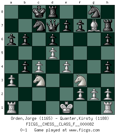 Last move : 0-1 2010 February 27 1:27:56 [Event "FICGS__CHESS__CLASS_F__000082"] [Site "FICGS"] [Date "2010.02.11"] [Round "1"] [White "Orden,Jorge"] [Black "Quanter,Kirsty"] [Result "0-1"] [WhiteElo "1165"] [BlackElo "1188"] 1.e4 b6 2.Nf3 Ba6 3.Bxa6 Nxa6 4.d4 c5 5.c4 d6 6.d5 Qd7 7.Nc3 Nc7 8.Ng5 h6 9.Qh5 g6 10.Qh4 Bg7 11.Nf3 O-O-O 12.a3 a6 13.b4 cxb4 14.Be3 g5 15.Bd4 gxh4 16.Bxg7 Rh7 0-1 Owen defense Queenside Castling by player Black (move 11) Player Black won this chess game. Follow this game move after move (download)Chess is played with the mind and not with the hands ! (Renaud and Kahn) Mein Name ist Rustam Kamsky. Sie haben meinen Sohn belästigt. Bereiten Sie sich aufs Sterben vor. (Rustam Kamsky) Nunca antes ha habido un jugador de Ajedrez con tal conocimiento a fondo de las complejidades del juego y una inmensa voluntad absolutamente indomable de ganar. Yo pienso que Fischer es el jugador mas grande que jamás haya existido. (Lisa Lane) Aux échecs, les retours au sommet sont rares : les dommages psychologiques consécutifs à une défaite sont trop sévères. (Daily Telegraph) Work expands to fill the time available. (C. Northcote Parkinson, in Parkinson's Laws)