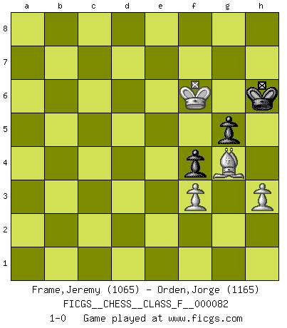 Last move : 1-0 2010 April 7 17:41:39 [Event "FICGS__CHESS__CLASS_F__000082"] [Site "FICGS"] [Date "2010.02.11"] [Round "1"] [White "Frame,Jeremy"] [Black "Orden,Jorge"] [Result "1-0"] [WhiteElo "1065"] [BlackElo "1165"] 1.e4 c5 2.Nf3 d6 3.c3 Nf6 4.d3 e6 5.Bg5 Be7 6.Nbd2 O-O 7.Be2 Nc6 8.d4 a6 9.O-O b5 10.e5 dxe5 11.dxe5 Nd5 12.Bxe7 Ndxe7 13.Nb3 Nf5 14.Nxc5 Qe7 15.b4 Rd8 16.Qc2 a5 17.a3 axb4 18.axb4 Bd7 19.Rxa8 Rxa8 20.Nxd7 Qxd7 21.Rd1 Qc7 22.Bd3 Nxe5 23.Nxe5 Qxe5 24.Qd2 Rd8 25.Qc2 g6 26.Bxf5 Rd6 27.Bd3 f5 28.g3 Kg7 29.Qe2 Qxc3 30.Bxb5 Qxb4 31.Rxd6 Qxd6 32.Qc4 Qd1+ 33.Qf1 Qf3 34.Be2 Qe4 35.Qd1 h5 36.Qd7+ Kh6 37.Bf1 e5 38.Qf7 f4 39.Qf8+ Kg5 40.gxf4+ Qxf4 41.Qxf4+ exf4 42.Bd3 h4 43.Kg2 Kh5 44.Kf3 g5 45.Bf5 h3 46.Bxh3 Kh4 47.Bf5 Kh5 48.Ke4 Kh4 49.h3 Kh5 50.f3 Kh6 51.Bg4 Kg6 52.Ke5 Kg7 53.Kf5 Kh6 54.Kf6 1-0 Sicilian Kingside Castling by player Black (move 6) Kingside Castling by player White (move 9) 10 pieces endgame at move 40 : White KQBPP , Black KQPPP WHITE : King + 1 Queen 1 Bishop 2 Pawns BLACK : King + 1 Queen 3 Pawns 9 pieces endgame at move 41 : White KQBPP , Black KPPP WHITE : King + 1 Queen 1 Bishop 2 Pawns BLACK : King + 3 Pawns 8 pieces endgame at move 41 : White KBPP , Black KPPP WHITE : King + 1 Bishop 2 Pawns BLACK : King + 3 Pawns 7 pieces endgame at move 46 : White KBPP , Black KPP WHITE : King + 1 Bishop 2 Pawns BLACK : King + 2 Pawns Player White won this chess game. Follow this game move after move (download)A good player is always lucky. (Jose Raul Capablanca) Ich könnte leicht behaupten: Ja,ja, Leonid Breschnew wollte nicht, daß ich Weltmeister werde. In der Tat war die Sache komplizierter. (Viktor Kortschnoi) Siempre es mucho mejor sacrificar las piezas de tu oponente. (Savielly Tartakover) Le pion, dans sa simplicité, marche droit devant lui, mais lorsqu'il prend, il le fait obliquement? Ainsi l'homme, tant qu'il reste pauvre, marche dans la droiture et vit honnêtement, mais lorsqu'il recherche les honneurs, il flatte, se parjure et, par les voies obliques, cherche une position supérieure sur l'échiquier du monde. (Jean de Galles) That's absurd. I love it. (Gregory House, House M.D.)