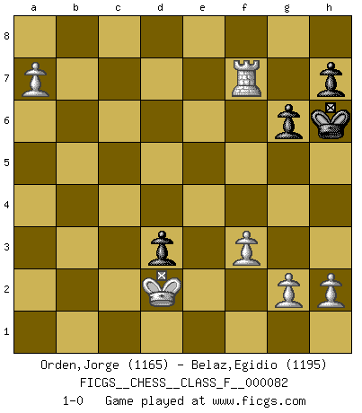 Last move : 1-0 2010 April 24 19:41:3 [Event "FICGS__CHESS__CLASS_F__000082"] [Site "FICGS"] [Date "2010.02.11"] [Round "1"] [White "Orden,Jorge"] [Black "Belaz,Egidio"] [Result "1-0"] [WhiteElo "1165"] [BlackElo "1195"] 1.e4 c5 2.Nf3 d6 3.d4 cxd4 4.Nxd4 e5 5.Nb3 Nf6 6.Be2 Be7 7.O-O Nxe4 8.Be3 O-O 9.f3 Nf6 10.c4 Nc6 11.Nc3 a6 12.Nd5 Nxd5 13.cxd5 Nb8 14.Nd2 b5 15.b4 Bb7 16.Ne4 Nd7 17.Qb3 a5 18.Bxb5 Ba6 19.bxa5 Bxb5 20.Qxb5 Rxa5 21.Qb4 Rxd5 22.a4 Qa5 23.Qxa5 Rxa5 24.Rfb1 Nf6 25.Rb6 d5 26.Nd6 d4 27.Bd2 Rd5 28.Bb4 Nd7 29.a5 Nc5 30.Nf5 Bd8 31.Bxc5 Rxc5 32.Rb8 g6 33.Nh6+ Kg7 34.a6 Ra5 35.Rxa5 d3 36.Rd5 Bc7 37.Rxf8 Bb6+ 38.Kf1 Bd4 39.Rxd4 exd4 40.Rxf7+ Kxh6 41.a7 d2 42.Ke2 d3+ 43.Kxd2 1-0 Sicilian Kingside Castling by player White (move 7) Kingside Castling by player Black (move 8) 10 pieces endgame at move 43 : White KRPPPP , Black KPPP WHITE : King + 1 Rook 4 Pawns BLACK : King + 3 Pawns Player White won this chess game. Follow this game move after move (download)When you absolutely don't know what to do anymore, it is time to panic. (John van der Wiel) Wenn Capablanka heute auf der Schachbühne erscheinen würde, hätte er ein halbes Jahr gebraucht um sich die Schachtheorie anzueignen. Und dann hätte er alles und jeden besiegt. (Mikhail Moiseyevich Botvinik) La vida es como un juego de Ajedrez, cambiando con cada movimiento. (Proverbio Chino) Un footballeur joue avec ses pieds, parfois avec sa tête. Un joueur d'échecs ne joue qu'avec sa tête. Et quand il ne joue plus, il meurt. (Jacob Murray) In every real man a child is hidden that wants to play. (Friedrich Nietzsche)