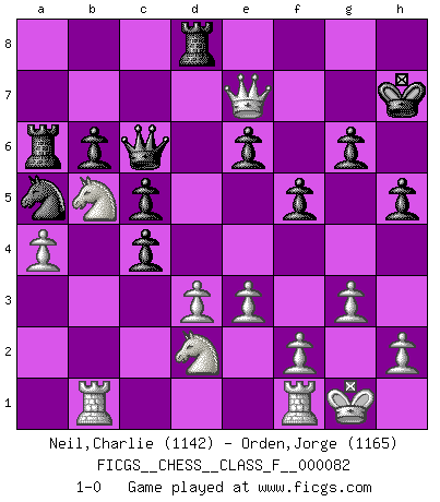 Last move : 1-0 2010 March 25 1:38:50 [Event "FICGS__CHESS__CLASS_F__000082"] [Site "FICGS"] [Date "2010.02.11"] [Round "1"] [White "Neil,Charlie"] [Black "Orden,Jorge"] [Result "1-0"] [WhiteElo "1142"] [BlackElo "1165"] 1.c4 c5 2.Nc3 Nc6 3.g3 g6 4.Bg2 Bg7 5.e3 e6 6.Nge2 Nge7 7.d3 O-O 8.a3 a6 9.Bd2 Qc7 10.Rb1 b6 11.Ne4 Bb7 12.Bc3 Bxc3+ 13.N2xc3 f5 14.Nd2 Rfd8 15.b4 Kg7 16.O-O d6 17.Qb3 h5 18.b5 Na5 19.Qb2 Bxg2 20.Kxg2 Kh6 21.bxa6 Rxa6 22.Nb5 Qc6+ 23.Kg1 Kh7 24.a4 d5 25.Qf6 dxc4 26.Qxe7+ 1-0 English : ultra-Symmetrical variation Kingside Castling by player Black (move 7) Kingside Castling by player White (move 16) Player White won this chess game. Follow this game move after move             (download)You have to have the fighting spirit. You have to force moves and take chances. (Bobby Fischer) Intelligenz läßt sich nicht am Weg, sondern nur am Ergebnis feststellen. (Garry Kasparov) Cada Peón es potencialmente una Reina. (James Mason) Dans le domaine de la peinture, de la gravure et de la sculpture, dès la première décennie de notre siècle, les artistes abandonnent la représentation de la partie d'échecs pour se concentrer sur les pièces, sur les échiquiers et sur toutes les variations auxquelles les unes et les autres peuvent donner lieu. On passe en quelque sorte d'un thème social à un thème musical (au sens de la musica médiévale, c'est-à-dire d'une notion qui inclue le rythme, l'harmonie, la construction et la déconstruction, etc.). Graphiquement et picturalement, l'échiquier apparaît comme une structure ouverte, dynamique, d'une richesse infinie, autorisant toutes les combinatoires et débouchant sur des mouvements et des rythmes de nature exponentielle. (Michel Pastoureau) Experience is the name we all give to our mistakes. (Oscar Wilde)