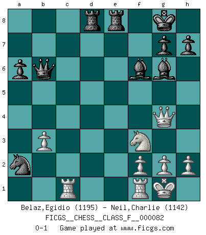 Last move : 0-1 2010 March 27 14:53:58 [Event "FICGS__CHESS__CLASS_F__000082"] [Site "FICGS"] [Date "2010.02.11"] [Round "1"] [White "Belaz,Egidio"] [Black "Neil,Charlie"] [Result "0-1"] [WhiteElo "1195"] [BlackElo "1142"] 1.e4 c5 2.Bc4 Nc6 3.Nf3 e6 4.O-O a6 5.Nc3 b5 6.Be2 Bb7 7.d3 Qc7 8.b3 Be7 9.Bb2 Nf6 10.d4 O-O 11.e5 Ne8 12.dxc5 Bxc5 13.Ne4 Be7 14.Bd3 Rc8 15.c4 bxc4 16.Bxc4 d5 17.Bxd5 exd5 18.Qxd5 Nb4 19.Qd2 Nc6 20.Rac1 Qb6 21.Nfg5 f6 22.exf6 Nxf6 23.Bxf6 Bxf6 24.Nc5 Rcd8 25.Qe3 Rfe8 26.Qf4 Nb4 27.Nce4 Bxe4 28.Qg4 Bg6 29.Nf3 Nxa2 0-1 Sicilian defense Kingside Castling by player White (move 4) Kingside Castling by player Black (move 10) Player Black won this chess game. Follow this game move after move (download)Chess is 99 percent tactics. (Teichmann) Den Ruhm habe ich schon, jetzt brauche ich noch das Geld. (Wilhelm Steinitz) Bobby Fischer es el jugador de Ajedrez mas grande que jamás haya existido. (Ken Smith) Je fais ceci parce que dans cinquante coups j'obtiendrai cela; je m'appelle Mikhail Moisevitch Botvinnik. (Botvinnik) A mistake is only a mistake if you let it happen twice. Otherwise it is a learning experience. (Daniel Parmet)