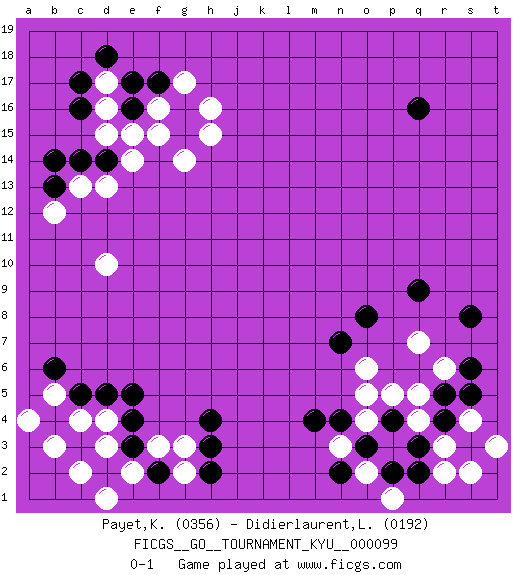 Last move : 0-1 2010 May 12 7:50:23 [Event "FICGS__GO__TOURNAMENT_KYU__000099"] [Site "FICGS"] [Date "2010.02.12"] [Round "1"] [Black "Payet,Kevin"] [White "Didierlaurent,Ludovic"] [Result "0-1"] [Rating 1 "0356"] [Rating 2 "0192"] 1.q16 d4 2.q3 d16 3.c3 c4 4.b4 b5 5.c5 b3 6.d5 c2 7.e4 d3 8.e5 a4 9.b6 f3 10.e3 e2 11.f2 g3 12.h4 q5 13.n4 q7 14.h2 g2 15.h3 d10 16.c14 c13 17.d14 d13 18.c17 e14 19.f17 d17 20.c16 e15 21.b13 b12 22.b14 h16 23.e16 f16 24.e17 d15 25.g16 f15 26.g15 g17 27.d18 g14 28.q9 h15 29.o8 o6 30.n7 r3 31.r4 q4 32.s3 r2 33.q2 s4 34.r5 s2 35.s5 t3 36.s8 r6 37.s6 o4 38.o3 n3 39.p4 o5 40.m4 o2 41.p2 p1 42.n2 p3 43.d2 d1 44.o3 p5 0-1 This go game has been lost on time (started : 2010.02.12 7:20:35) Here are the names of the openings (joseki) played in the four corners : Corner d4 : d4 c3 Hoshi (Hwajeom, Seongjeom, Xingwei`) 4-4 Point. The star or hoshi (4-4) point, emphasizing influence at the potential expense of territory. Corner q4 : q3 q5 Komoku (Somok, Xiao~mu`) 3-4 Point. The komoku (3-4) point is the traditional corner enclosure move.. Ikken Takagakari (Hankan Nop'dakeolch'im, Yi Gaogua`jiao~, 1-Space High Approach). The 5-4 approach move has become more popular in modern times, as modern Go emphasizes speed and influence. Corner d16 : d16 c14 Hoshi (Hwajeom, Seongjeom, Xingwei`) 4-4 Point. The star or hoshi (4-4) point, emphasizing influence at the potential expense of territory. Ikken Kakari (Hankan Keolch'im, Yi Gua`jiao~, 1-Space Low Approach). Black 2 is the standard approach move to the 4-4. Player White won this Go (weiqi, baduk) game. Follow this game move after move (download)The rectangular six is normally alive. (Anonymous) True nature is revealed in times of difficulty. (Chinese proverb)