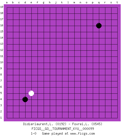 Last move : 1-0 2010 March 15 21:53:38 [Event "FICGS__GO__TOURNAMENT_KYU__000099"] [Site "FICGS"] [Date "2010.02.12"] [Round "1"] [Black "Didierlaurent,Ludovic"] [White "Foxrel,Lucas"] [Result "1-0"] [Rating 1 "0192"] [Rating 2 "0545"] 1.q16 e5 2.d4 1-0 This go game has been lost on time (started : 2010.02.12 7:20:35) Here are the names of the openings (joseki) played in the four corners : Corner d4 : e5 d4 Go-no-go (Wu~wu~) 5-5 Point. The 5-5 was experimented with briefly during the "New Fuseki" movement in Japan in the 1930s. The 5-5 point has not retained popularity because the 4-4 hoshi (star) point strikes a better balance between influence and territory. As one can see from the variations, though, the 5-5 is playable. Player Black won this Go (weiqi, baduk) game. Follow this game move after move (download)To invade, need 20 points in open area; otherwise, keshi is best. (Yang Yilun, 7p) There are 10 types of people in this world: those who understand binary and those who don't. (Anonymous)