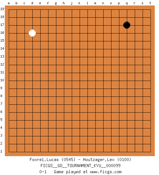 Last move : 0-1 2010 March 17 21:16:46 [Event "FICGS__GO__TOURNAMENT_KYU__000099"] [Site "FICGS"] [Date "2010.02.12"] [Round "1"] [Black "Foxrel,Lucas"] [White "Houtzager,Lex"] [Result "0-1"] [Rating 1 "0545"] [Rating 2 "0100"] 1.q17 d16 0-1 This go game has been lost on time (started : 2010.02.12 7:20:35) Here are the names of the openings (joseki) played in the four corners : Player White won this Go (weiqi, baduk) game. Follow this game move after move (download)Each step in a ladder is worth 7 points. (Anonymous) It's not the size of the dog in the fight, it's the size of the fight in the dog. (Mark Twain)