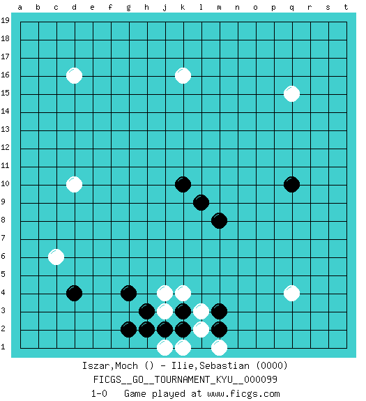 Last move : 1-0 2010 April 9 20:46:3 [Event "FICGS__GO__TOURNAMENT_KYU__000099"] [Site "FICGS"] [Date "2010.02.12"] [Round "1"] [Black "Iszar,Moch"] [White "Ilie,Sebastian"] [Result "1-0"] [Rating 2 "0000"] 1.k10 q15 2.l9 d16 3.m8 q4 4.d4 d10 5.q10 k4 6.k3 j3 7.j2 l3 8.k2 j4 9.g2 l2 10.h3 c6 11.g4 k16 12.l1 m1 13.m2 k1 14.m3 j1 15.h2 1-0 This go game has been lost on time (started : 2010.02.12 7:20:35) Here are the names of the openings (joseki) played in the four corners : Corner d4 : d4 j3 Hoshi (Hwajeom, Seongjeom, Xingwei`) 4-4 Point. The star or hoshi (4-4) point, emphasizing influence at the potential expense of territory. Player Black won this Go (weiqi, baduk) game. Follow this game move after move (download)Keep away from thickness. (Anonymous) Gambling : The sure way of getting nothing from something. (Wilson Mizner)